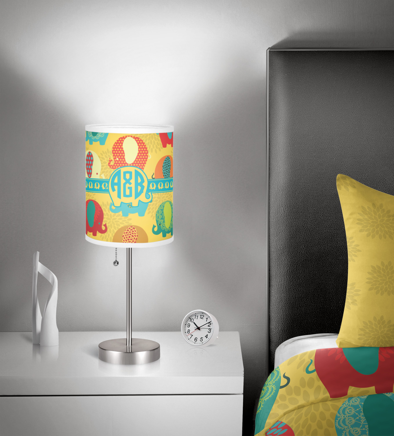 We have many different elephant design for you to chose from and if you are looking for something cute and adorable, then this is the design for you. This cute elephants design is absolutely the most adorable design. It has cute & pudgy elephants in different colors on a tone on tone background on mum flowers. The background color is re-color-able - and we chose to use the yellow African safari color.