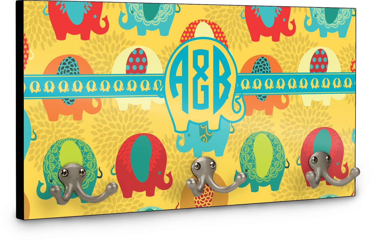 This coat rack is the perfect way to add some personality to your wall or entryway. The board is made of a strong maple that is approximately 16" x 8". The three 2-prong hooks are a sturdy metal that have three screws attaching them to the board. Your design is printed right onto the front of the board while the back and sides are a simple black.