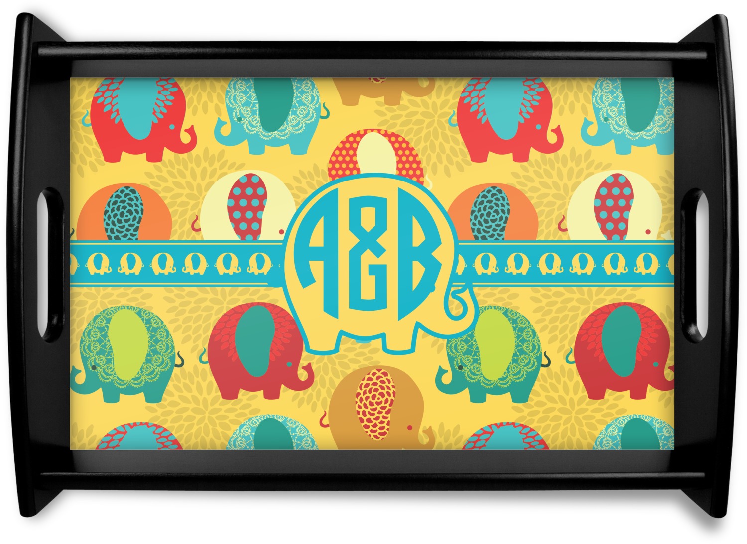 This serving tray with handles features square edges and two rounded sides, creating a very modern look. Each side is fabricated from a beautifully cut, natural wood. The bottom of the interior of the tray displays your customized design in bright, vibrant color. The tray is sold in both a black color and a natural wood look. Each variation of the wood serving tray has two sizes: Small, which is 14" x 10" x 2.25", and Large, which is 19.5" x 13.5" x 2.75".