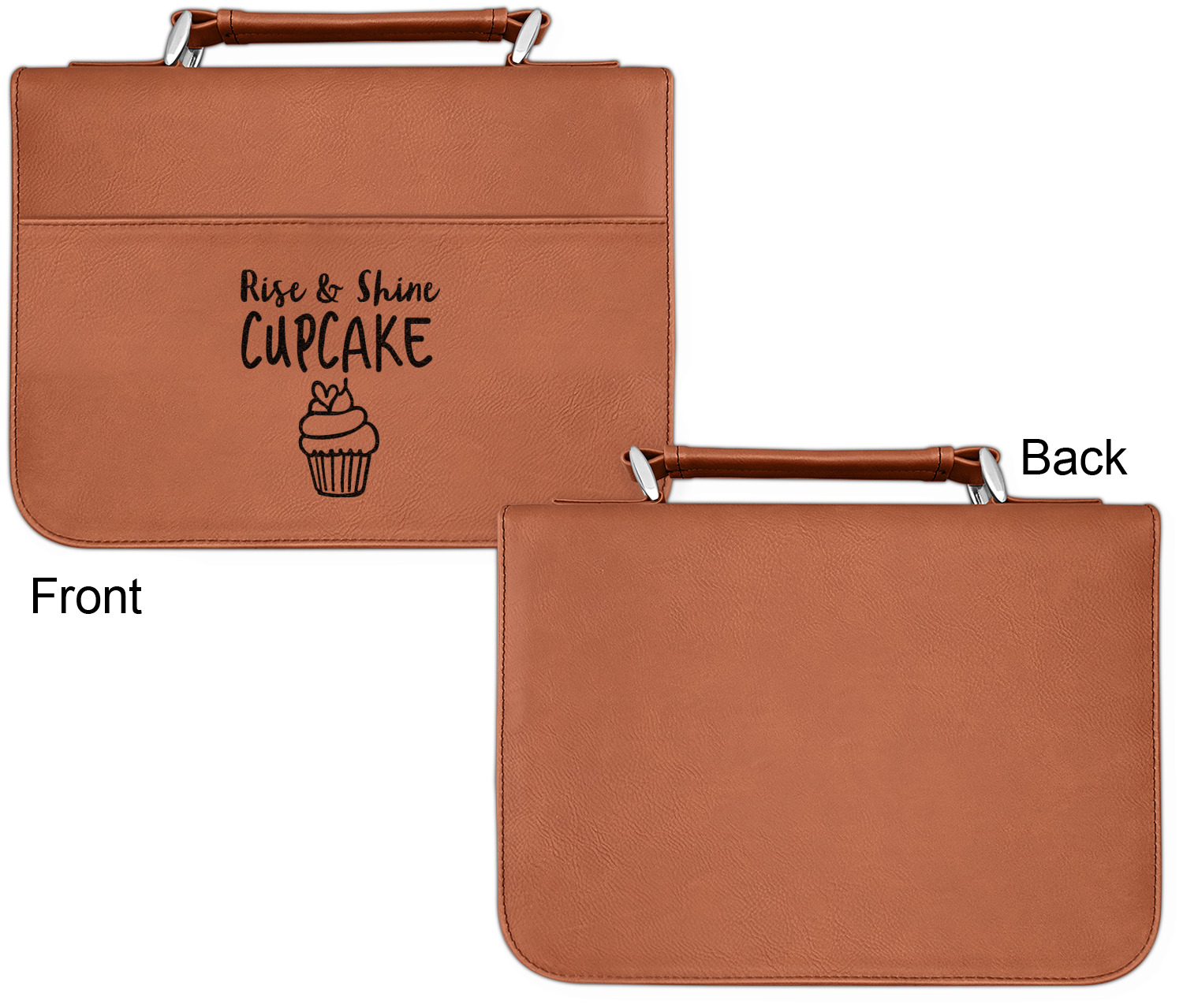 These book covers are fabricated from a fine leatherette in a warm, cognac shade of brown. A wide pocket spans across the front of the book jacket [2,400] and can store any loose papers or notes that you wish to keep. The interior of this personalized Bible cover includes slots on both sides to house the covers of your Bible, and keep it in place. The inside of the spine has a small elastic band to secure a pen. A zipper lines three sides of the cover, while the fourth side features a reinforced handle that allows for easy transport of your enclosed book.
