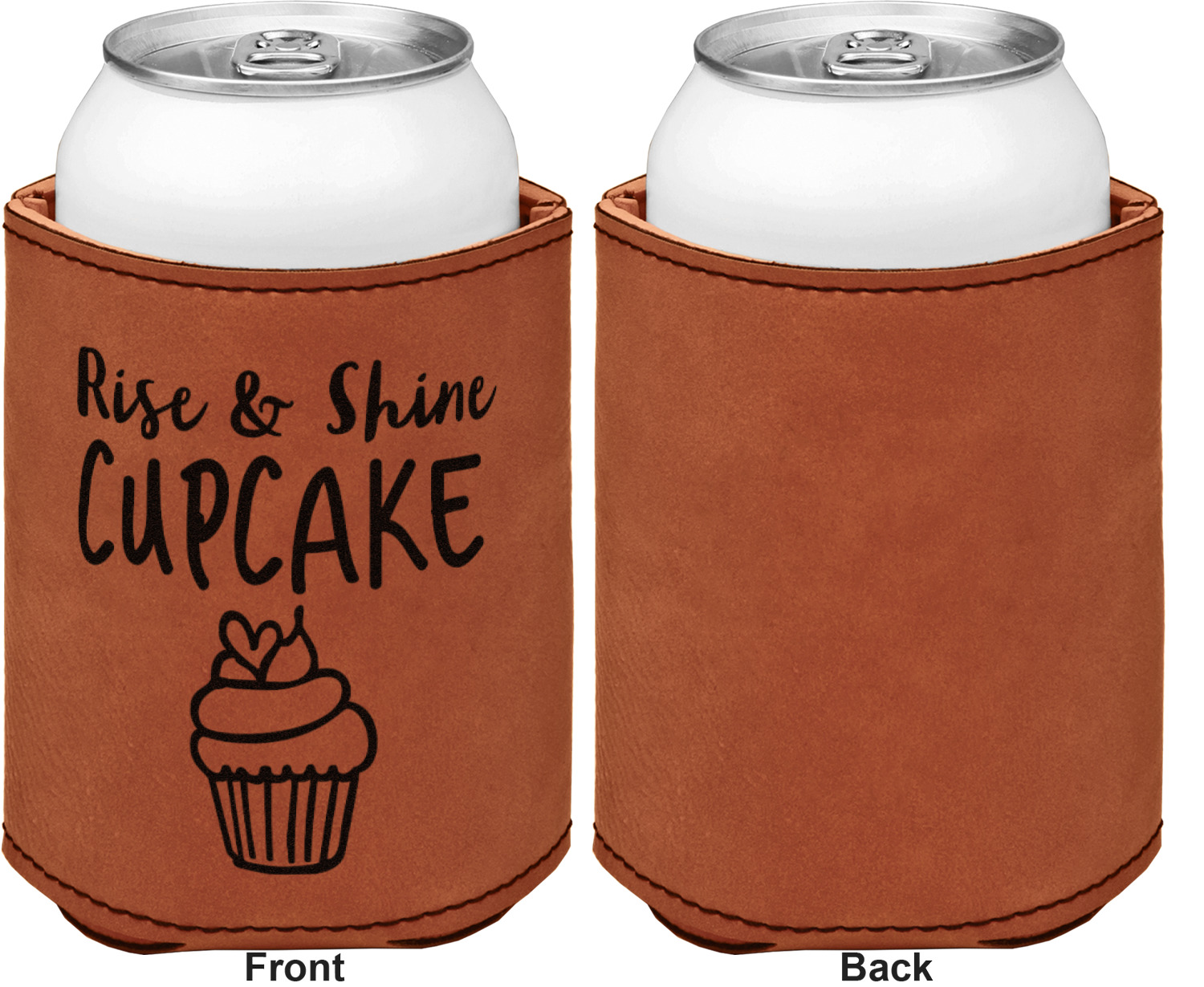 This can sleeve is made from a cognac-brown leatherette and stitched with a sturdy, black thread. A slim padding lines the inside of your can sleeve to allow for a better fit once your drink is inserted. The sleeve itself measures at 4 by 4.5 inches, allowing this custom can sleeve to accommodate most canned drinks. Your personalized design can be engraved on the front and back, or solely the front. When laser-engraved, your design appears as a black coloration which contrasts the leatherette nicely.