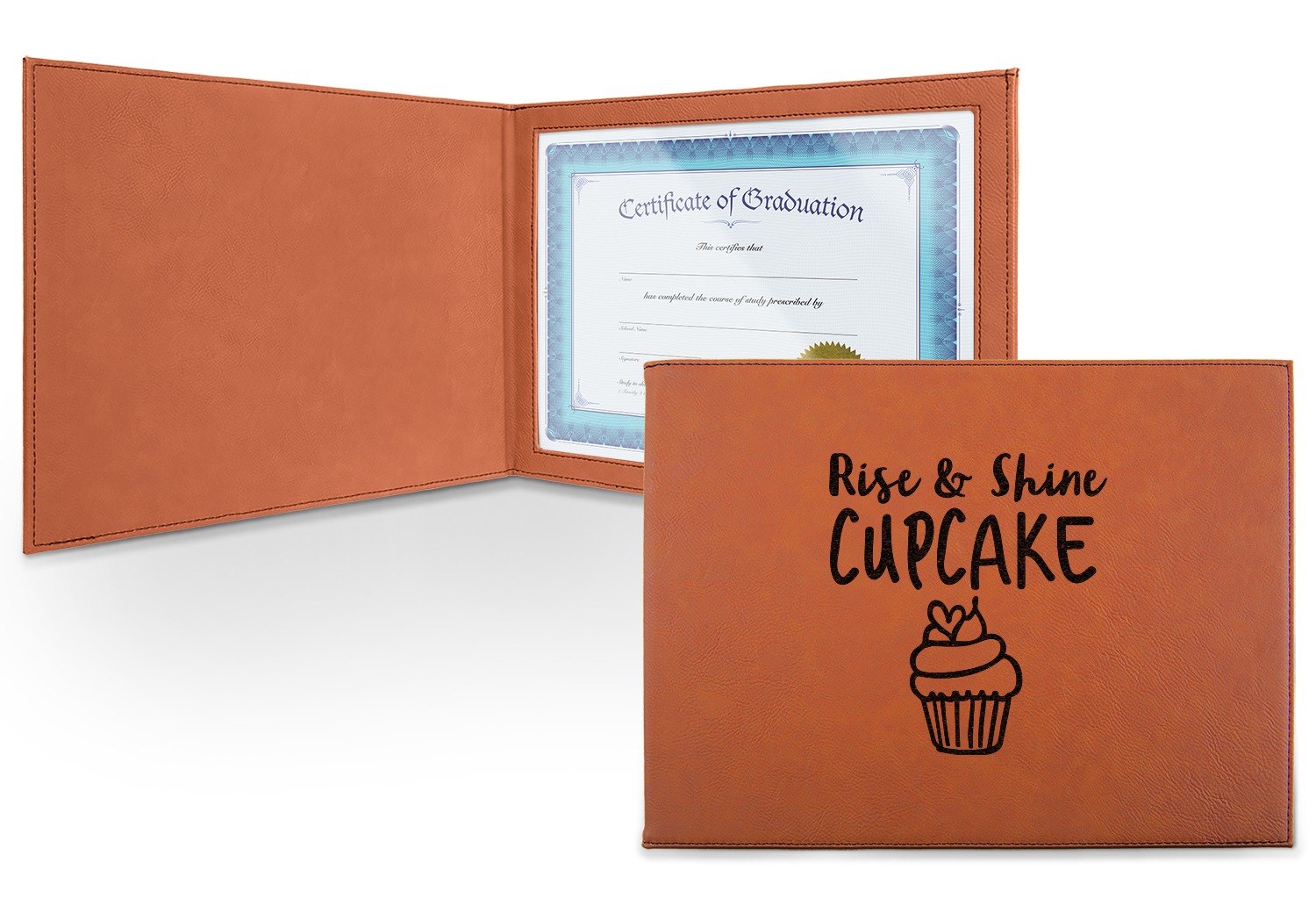 This cognac-colored, leatherette certificate jacket is the ideal way to display or store your hard-earned certificate. When closed, the custom certificate holder measures at 12 by 9 inches. The interior of the certificate cover includes a clear, vinyl window to encase your diploma. The window measures at around 10.5 by 7.5 inches and can accommodate a diploma that measures at up to 8.5 by 11 inches. You can either choose to have your customization laser engraved on the front and interior, or solely the front.