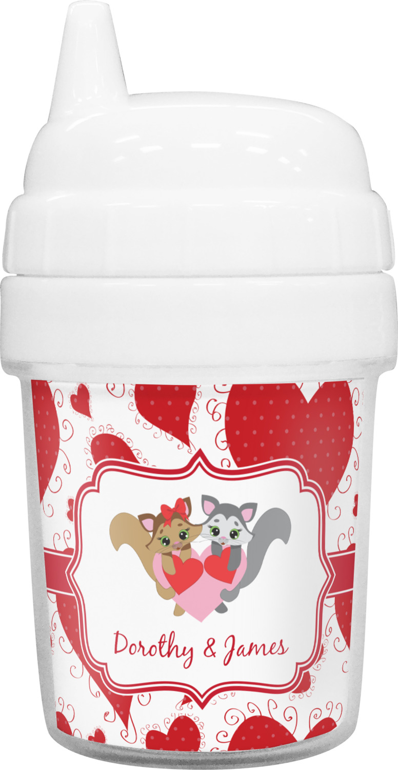 Our toddler cups are free of BPA, and have a twist-open lid so that you can easily fill and clean these cups for your young ones. Each cup also comes with a sippy nozzle to reduce spills. We offer these custom sippy cups in two different sizes; we have a baby sippy cup that holds 5 ounces, and a toddler sippy cup that holds 10 ounces. Your customization is printed on a premium glossy media insert that is placed within these toddler drinking cups.