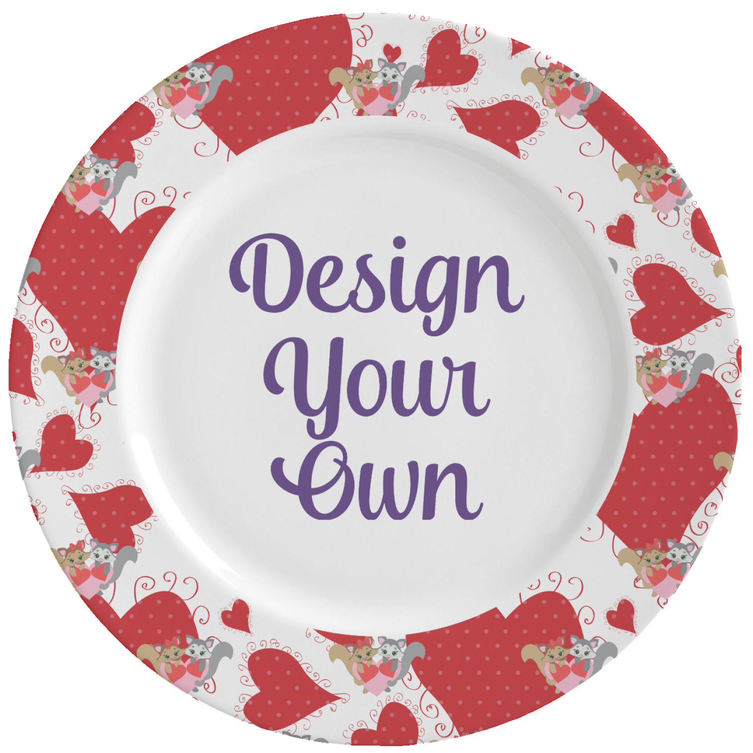With this custom dinner plate, your have the option of personalizing the rim with an attractive pattern, and then displaying a name, graphic, or text in the center of the plate, against a white background. The exterior of this plate is also the same classic, white color. A glaze coats your plate, making your vividly colored design seem even more vibrant.