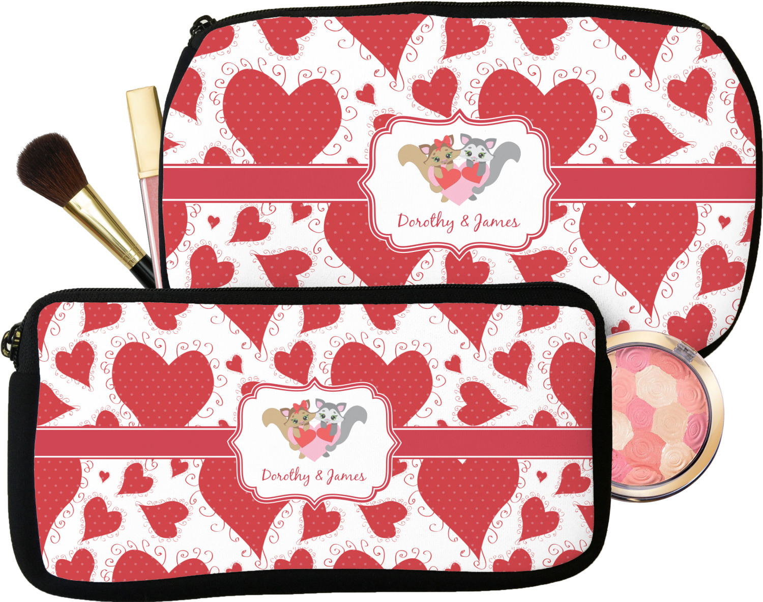 Our personalized makeup bags are available in many different designs, patterns and colors - so you are sure to find one that will love. They are made of neoprene (same material as wet-suits) and thus are water resistant, so spillages in your makeup bag will not end up all over you purse. They are customized on one side and are black on the other side and the zipper is black as well.