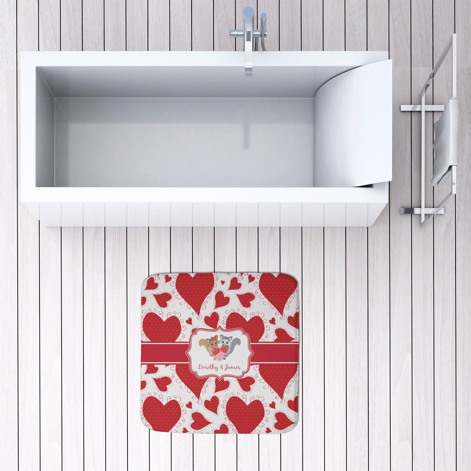 We offer this custom bath mat in four different sizes, so that you can choose the proper size for your bathroom and shower space. We suggest measuring the area before so that you can make an informed purchase. The four sizes are as follows: 24 by 17 inches, 34 by 21 inches, 48 by 36 inches, and 48 by 48 inches.