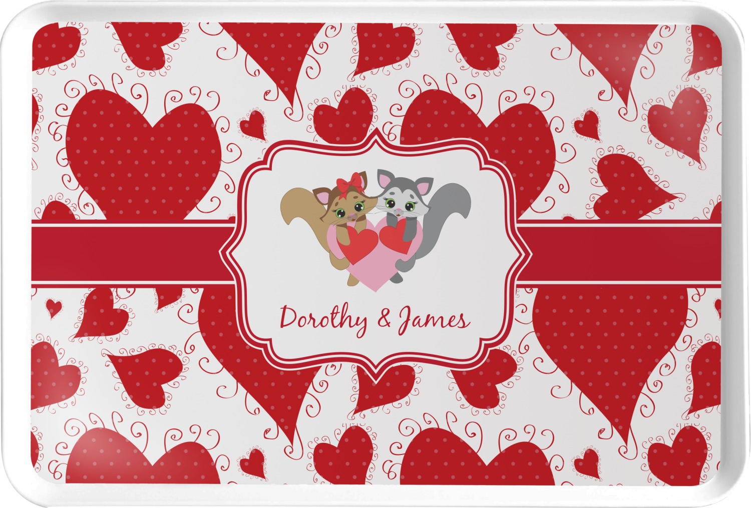 Made from a heavy melamine, these decorative trays are break resistant and are BPA free. At 14" x 9.25", these serving dishes are spacious enough to accommodate several drinks, bowls, or more. The tray features ridges underneath that allow for a sturdy stance upon any table or counter-top. We display your customization at the bottom of the tray's interior, while the remaining sides of the tray are a chic white.
