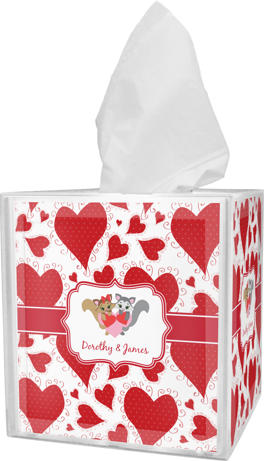 These tissue holders are built from durable acrylic and display your unique personalization on fine-quality vinyl inserts placed within the four sides and top. The box features two pieces, allowing you to easily switch out tissue boxes. On the sides, youll find ridges that ensure the top and base fit securely in place. The bottom of these tissue box holders has four, rubber, non-slip pads to prevent the box from scuffing any surface you decide to display it on. Each box can fit a standard 5 by 5-inch box of tissues.