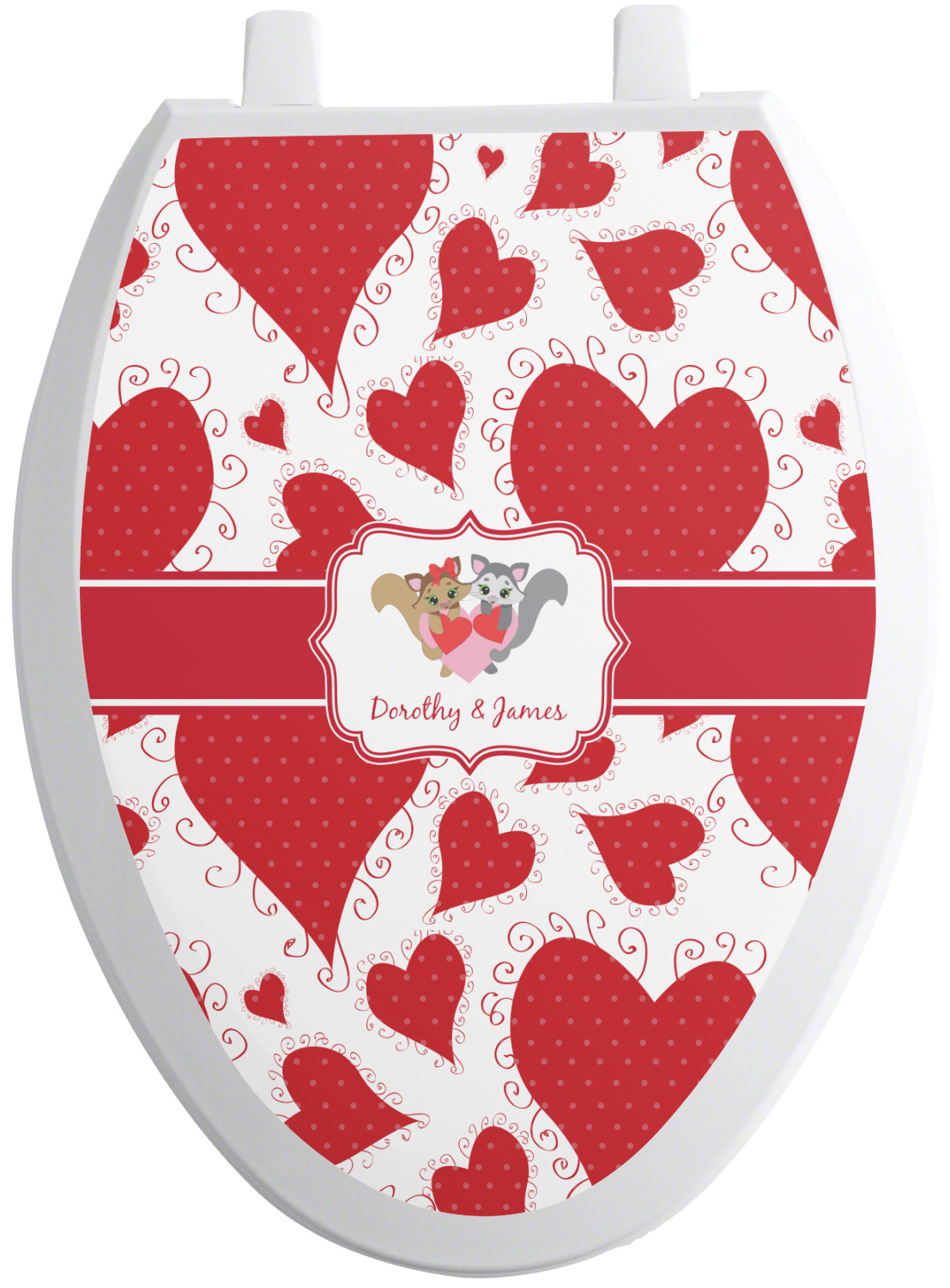 We sell these toilet lid decals in two different shapes to accommodate a wider range of toilet seat shapes. The first shape is our standard, round size, which measures at 13.5 by 12 inches. Our second option is an elongated shape, suited for long toilet seat covers. It measures 15 by 12 inches.
