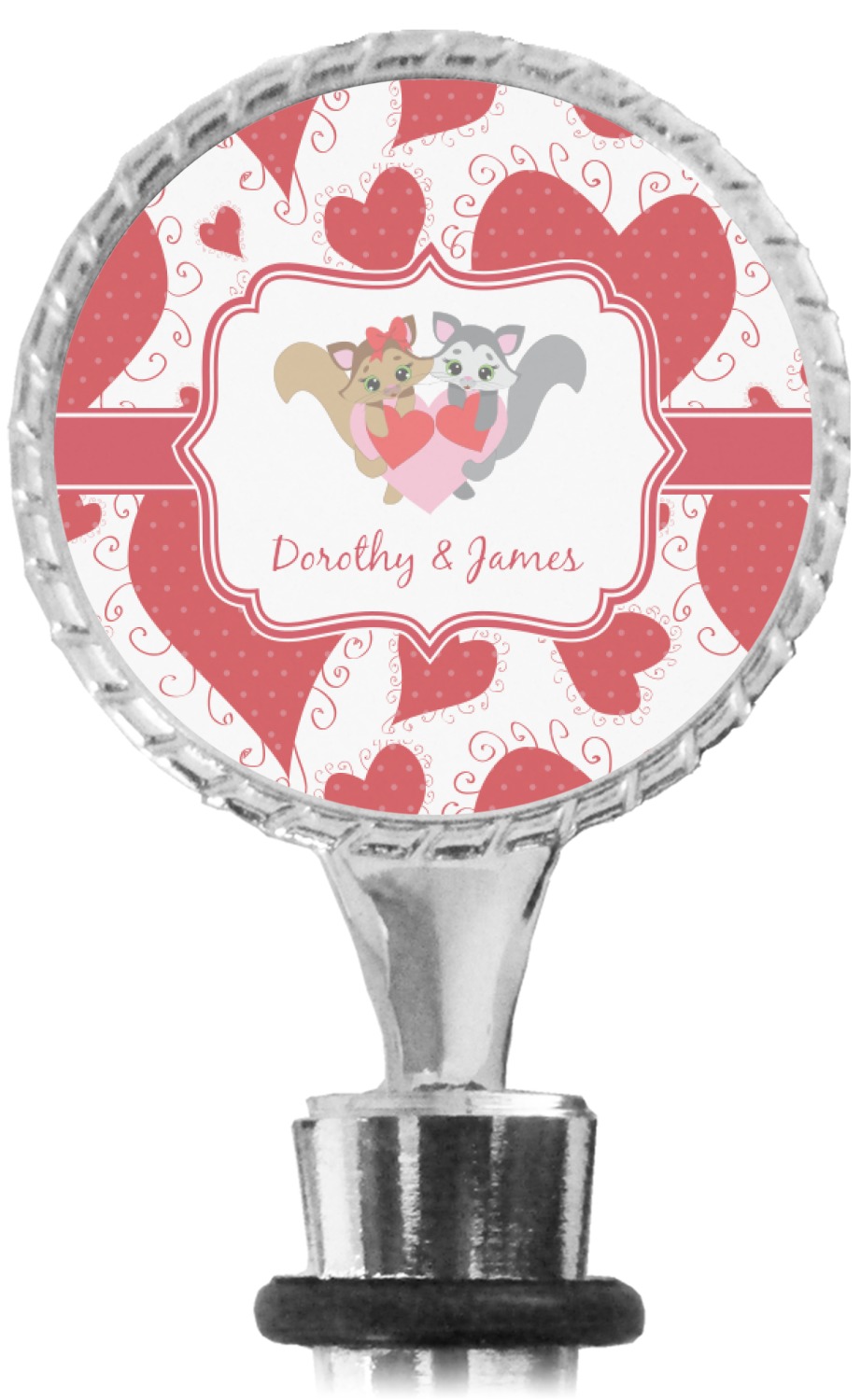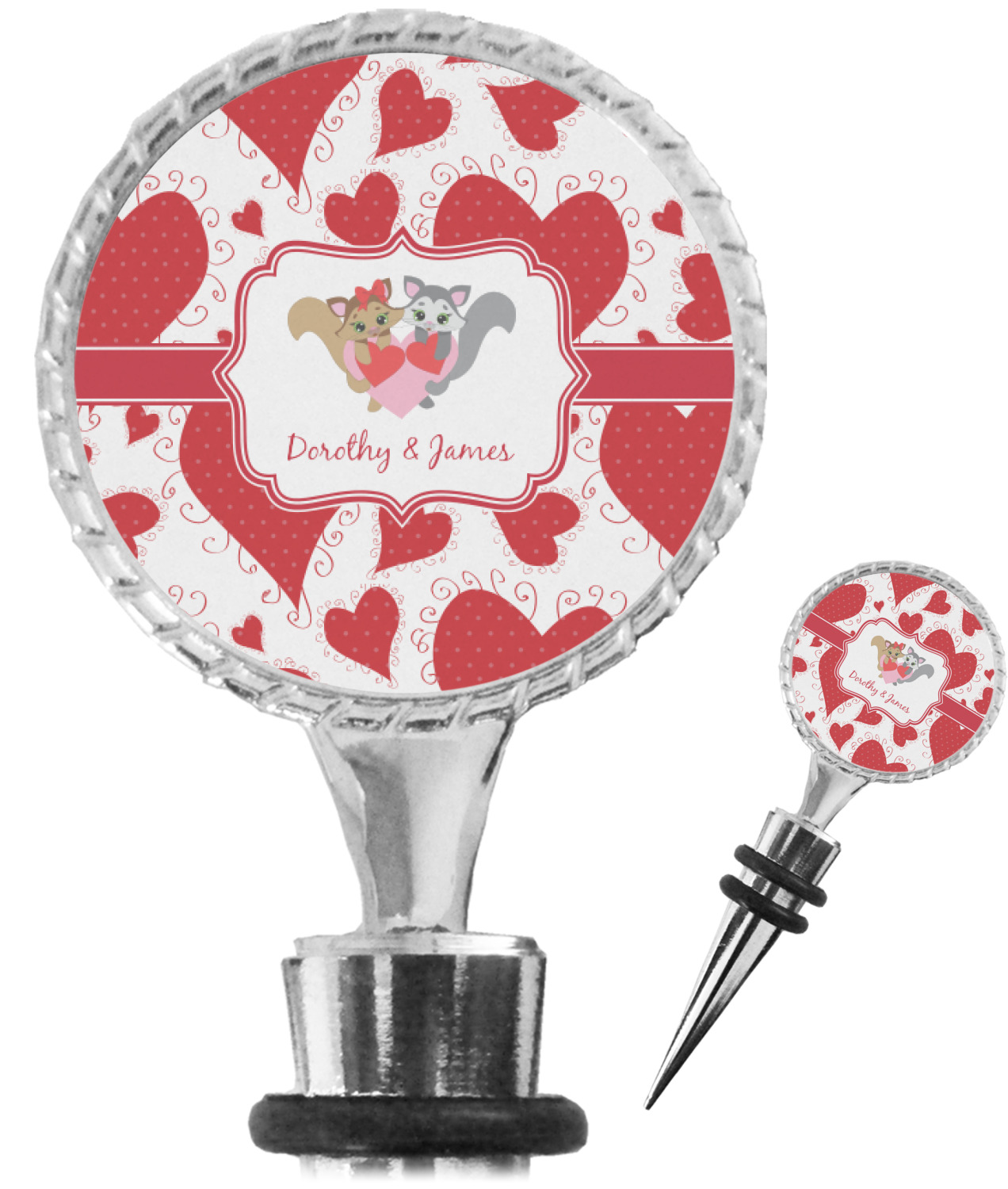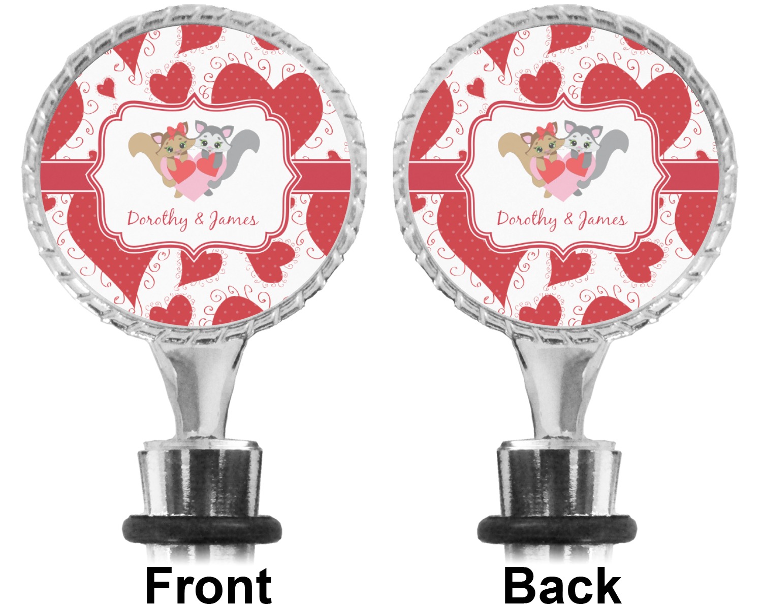 The top part of your bottle stopper is comprised of a zinc ring that displays your customization(s) in its middle, on both sides. The ring is heavy duty, with a bright chrome finish. The body of the wine stoppers have two silicone rings to provide an airtight seal. These wine bottle stoppers measure at 1.625" L x 0.8125" W x 4.625" H; your custom wine stopper is meant to fit into most standard-sized wine bottles.