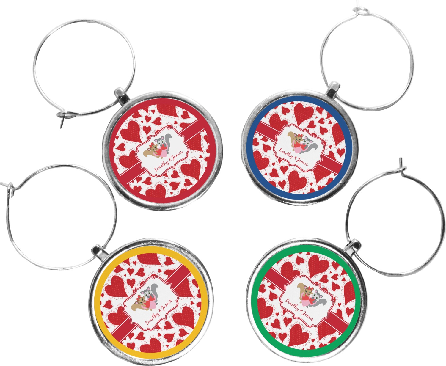 Your wine glass markers are comprised of a circular zinc plate with a 1.25 inch diameter. The zinc plate hangs from a zinc loop, which can be easily secured and removed from the stem of a wine glass. Your customized design is printed onto a 1 inch diameter insert, and then placed into the wine glass charm itself. Though sold in a set of four, you can personalize each charm individually and change the colors of the ring around your design, depending on your needs.