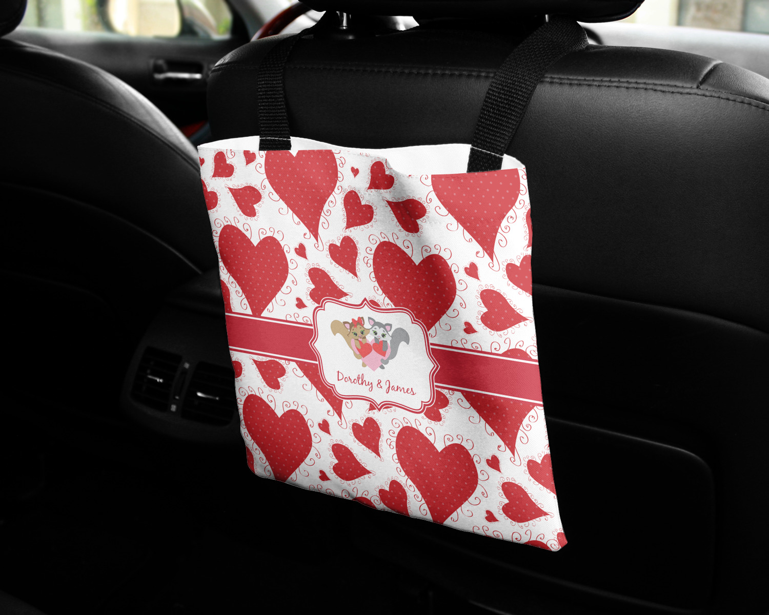 These car back seat organizers are sturdy tote-like bags, fabricated from a robust polyester, and features a single handle on the back side. The strap features an attachable velcro for easy attachment to headrests, grocery carts, car seats, and more. Simply undo the velcro, loop the strap around the headrest, reattach the velcro, and let the organizer hang from the front seat. These car organizers are the perfect means of increasing your backseat's legroom, while storing multiple items in one place for better accessibility. Each car back seat organizer measures at 10 by 10 inches, and features your personalized design printed across its front and back.