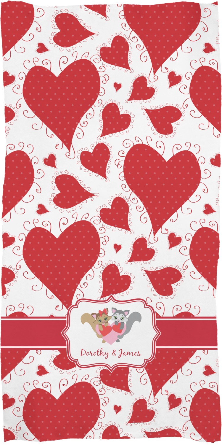 These customized bath towels are slightly larger than your standard towel and are the ideal size for wrapping around your body. They measure approximately 60" x 30". Your customization is displayed across the entire front face of the towel, while the back is white.
