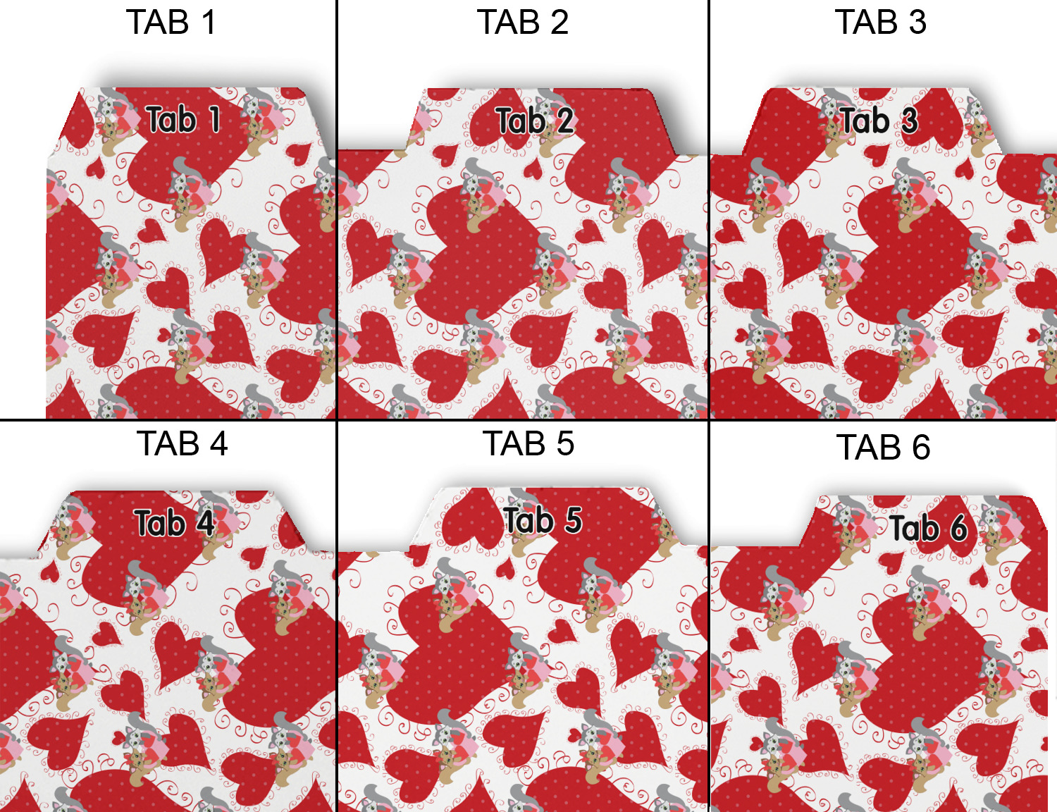 Whether you use binders at school or at work, we have designs to suit all of them. Available in 5 or 6 tab sets, you are sure to find a set to suit your needs. The back of each one is white and can be used to take notes, write vital information on, etc.