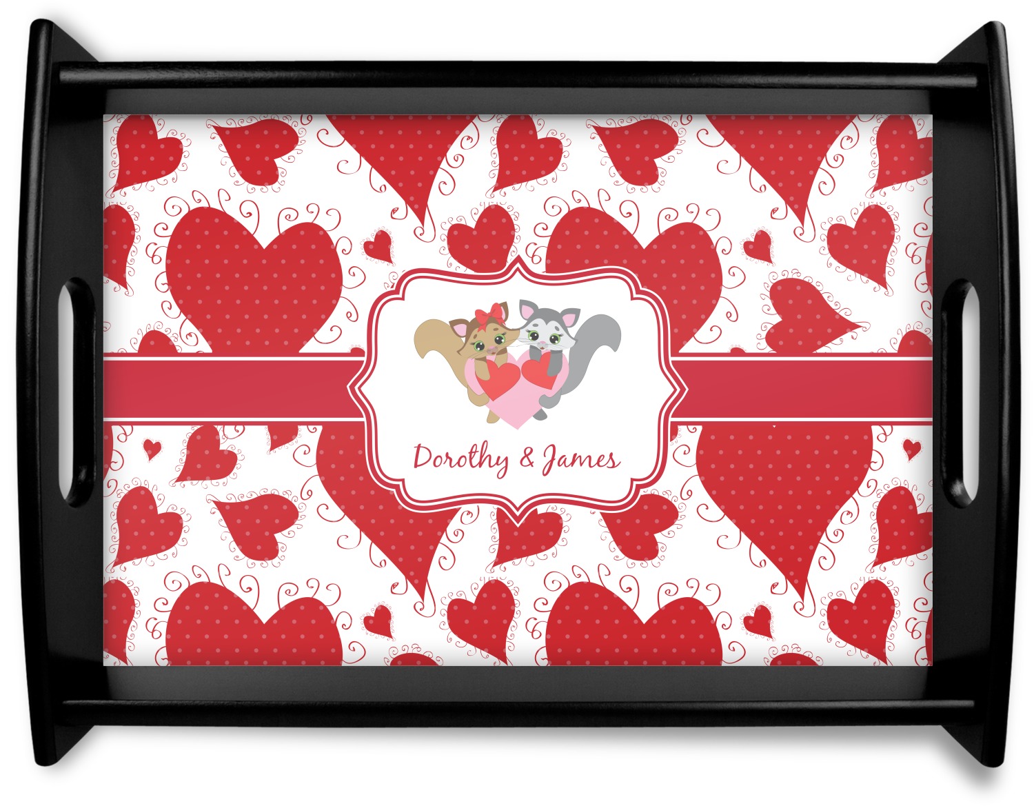 This serving tray with handles features square edges and two rounded sides, creating a very modern look. Each side is fabricated from a beautifully cut, natural wood. The bottom of the interior of the tray displays your customized design in bright, vibrant color. The tray is sold in both a black color and a natural wood look. Each variation of the wood serving tray has two sizes: Small, which is 14" x 10" x 2.25", and Large, which is 19.5" x 13.5" x 2.75".