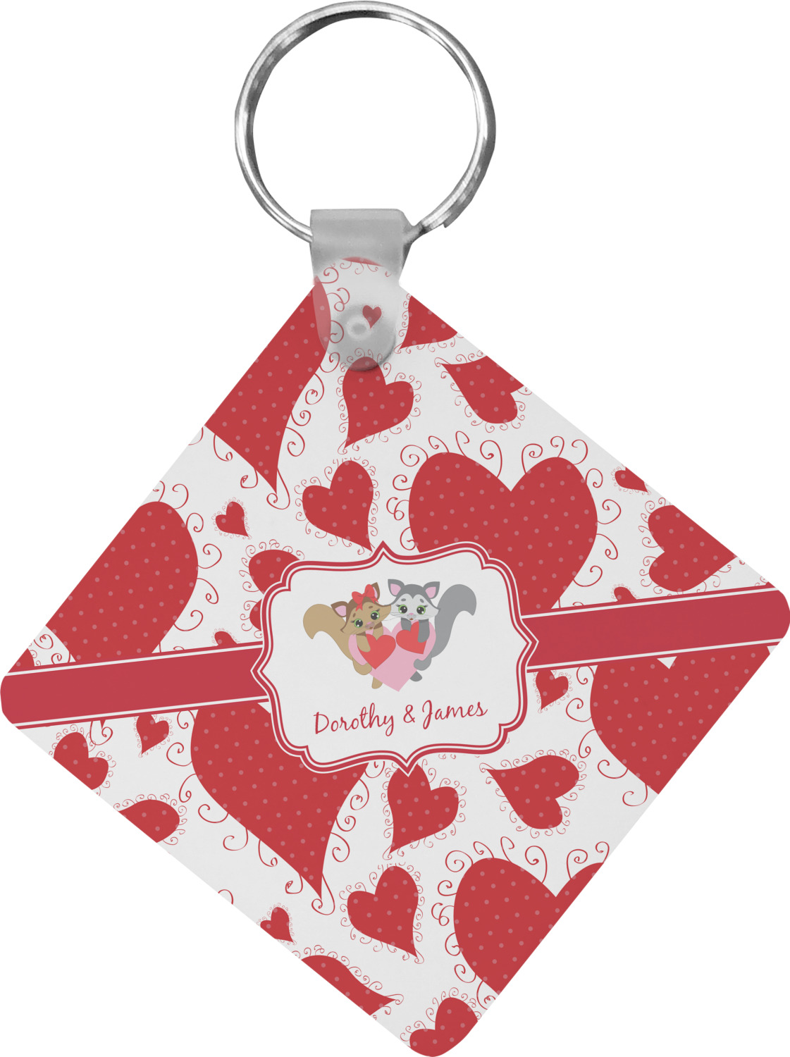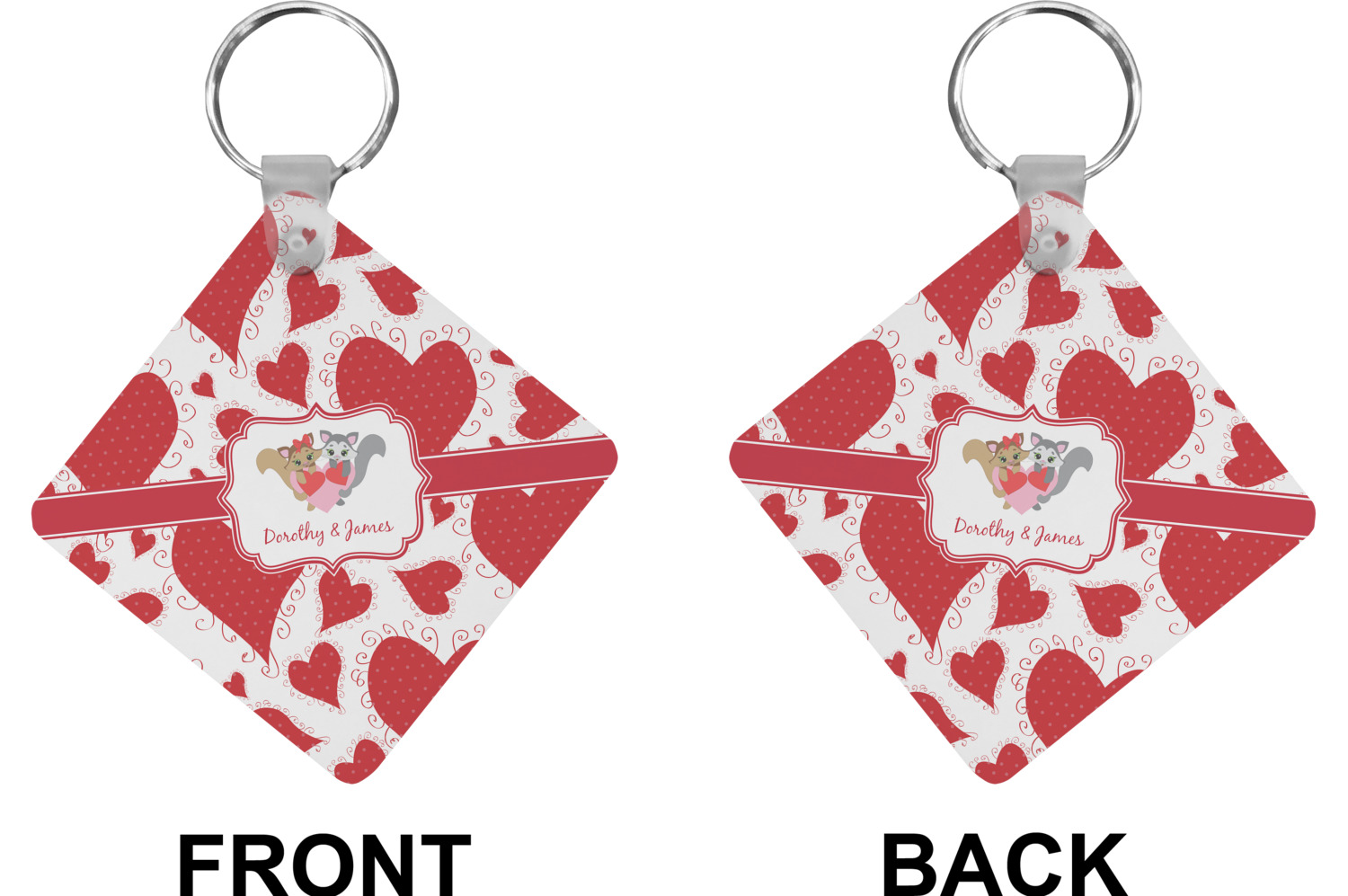 Our personalized keychains attach to the included metal, split key ring with a plastic, removable snap. Since a metal ring is included with your purchase, you have the liberty to keep your keys together on the ring, with or without your unique keychain. We offer this keychain in three different shapes: circle, heart, or diamond. We print your personalized design(s) on both sides of the key chain, and the surface has a glossy, reflective finish that only emphasizes your design. Each keychain is approximately 2.25 by 2.25 inches.