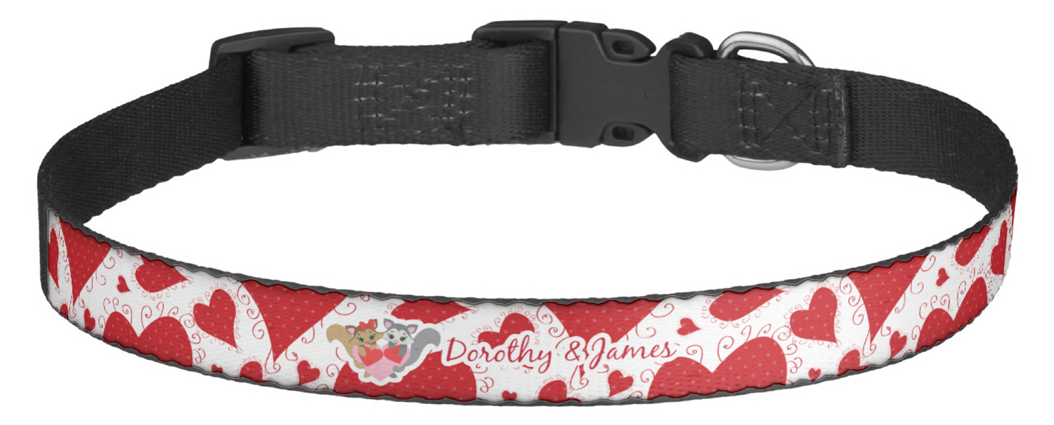 This sturdy collar, made from a durable nylon weave, will outlive your dog's episodes of excited tugging and pulling. Courtesy of its thick plastic buckle and adjuster, this collar is adjustable and accommodating of any dog. Structurally, the collar is a single piece of nylon weave that is sewn together, and features a solid metal loop where you can attach a leash or dog tag. We print and display your dog's name and pattern across the middle of the personalized dog collar.