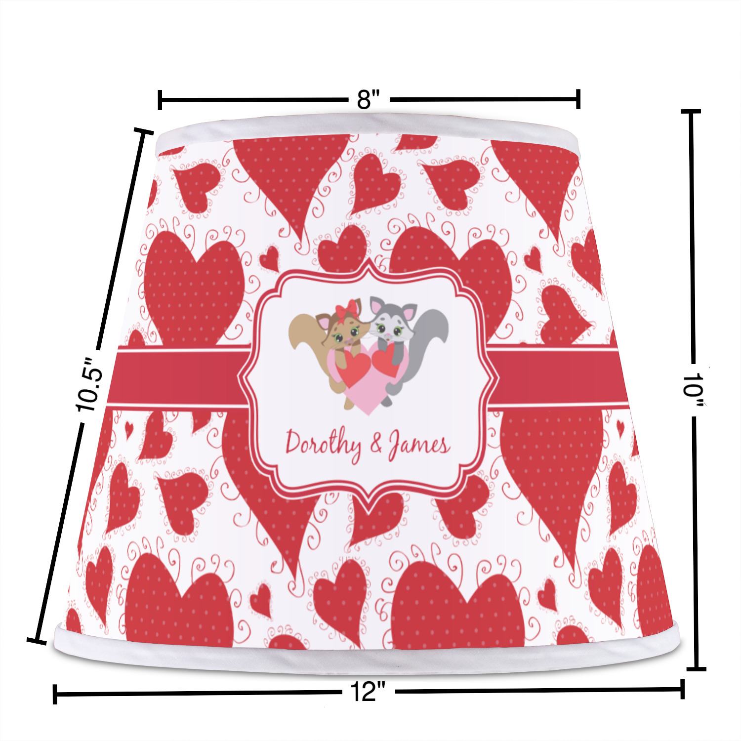 The base of this lampshade is 12 inches in diameter, and the top spans 8 inches in diameter. The total height of the lampshade is 10 inches. The angled nature of this custom lampshade concentrates the light, making it ideal for smaller spaces. This lampshade is made of matte, polyfilm, and displays your customization in its middle. The top and bottom of this colorful lamp shade are lined with a white fabric ribbon (which can be replaced with black inside the design studio) which frames your design and creates a sophisticated finish. As an UNO fitter lampshade, this unique lamp shade will fit a variety of bases.