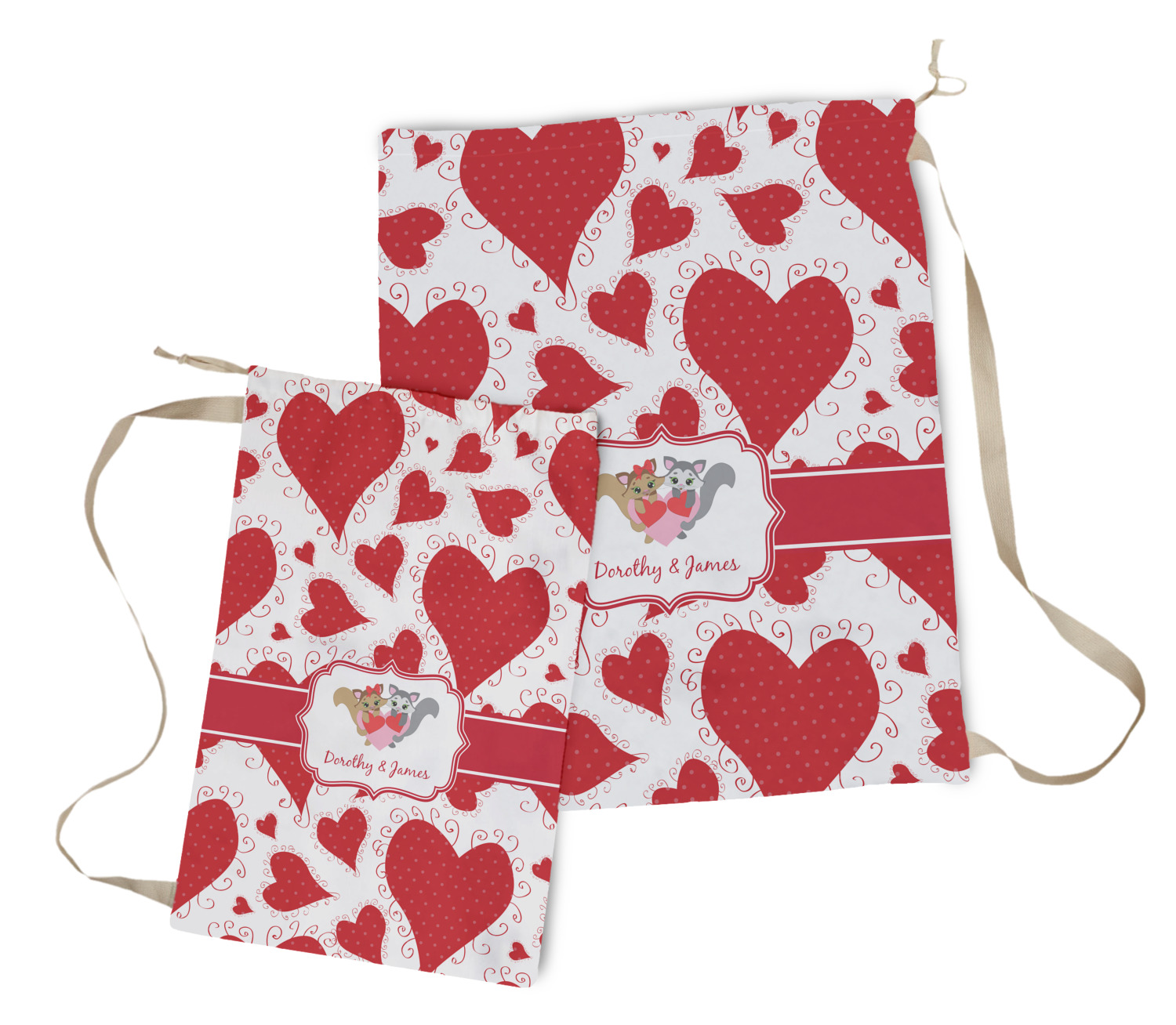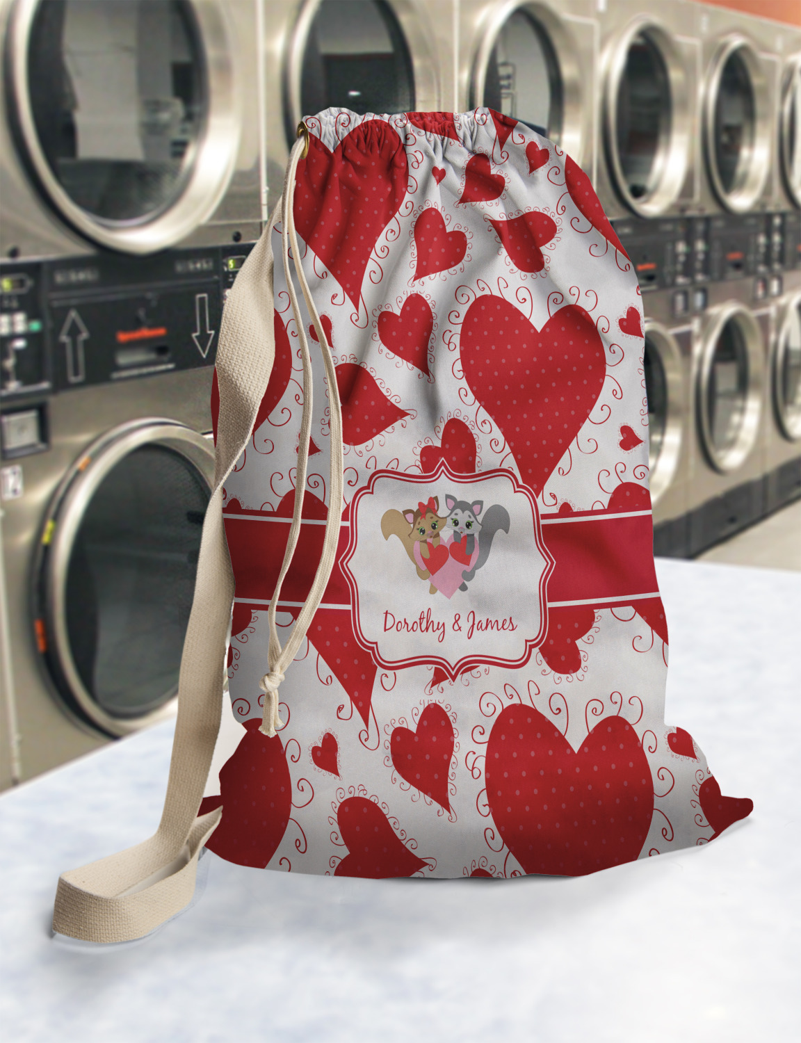 Carry your laundry in style with these customized laundry bags. Available in two sizes, featuring a natural colored woven strap and a cinch cord, these bags hold a lot of clothes or anything else you want to fit in them.