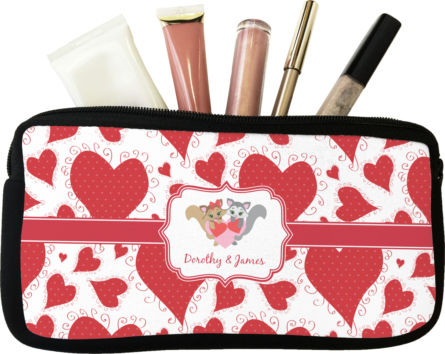 Our personalized makeup bags are available in many different designs, patterns and colors - so you are sure to find one that will love. They are made of neoprene (same material as wet-suits) and thus are water resistant, so spillages in your makeup bag will not end up all over you purse. They are customized on one side and are black on the other side and the zipper is black as well.