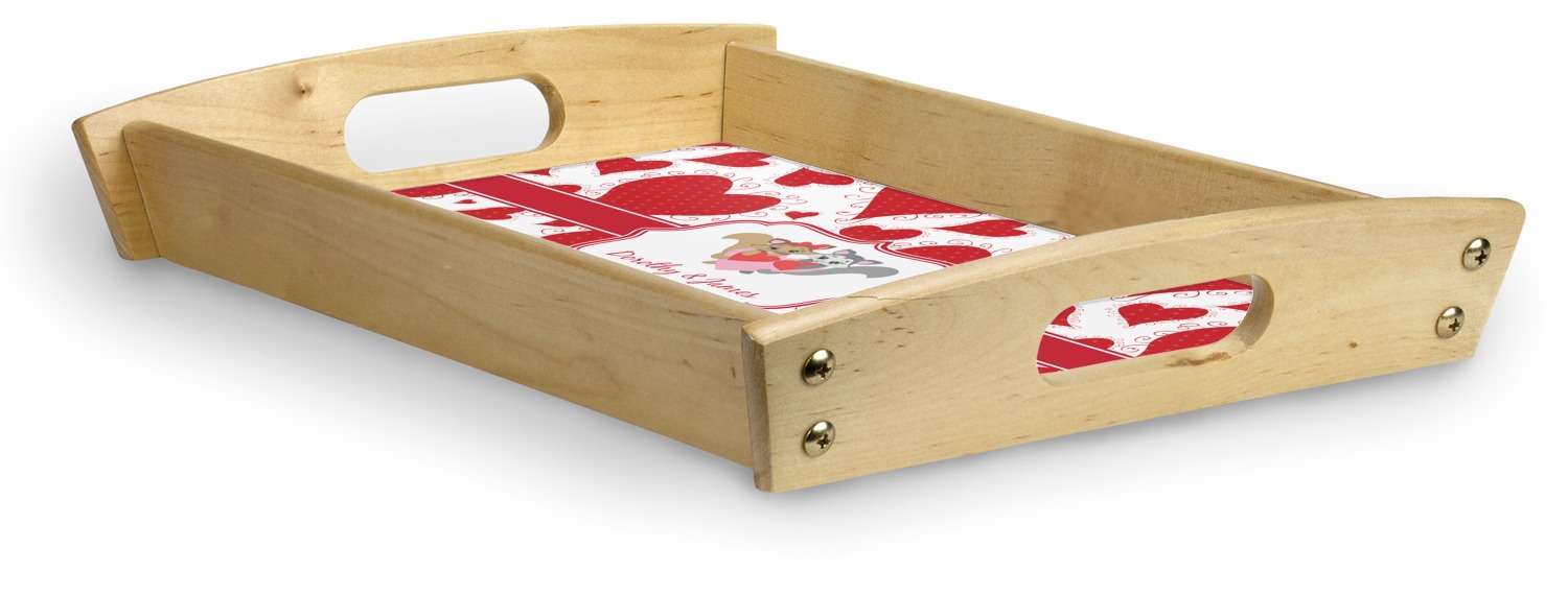 This serving tray with handles features square edges and two rounded sides, creating a very modern look. Each side is fabricated from a beautifully cut, natural wood. The bottom of the interior of the tray displays your customized design in bright, vibrant color. The tray is sold in both a black color and a natural wood look. Each variation of the wood serving tray has two sizes: Small, which is 14" x 10" x 2.25", and Large, which is 19.5" x 13.5" x 2.75".