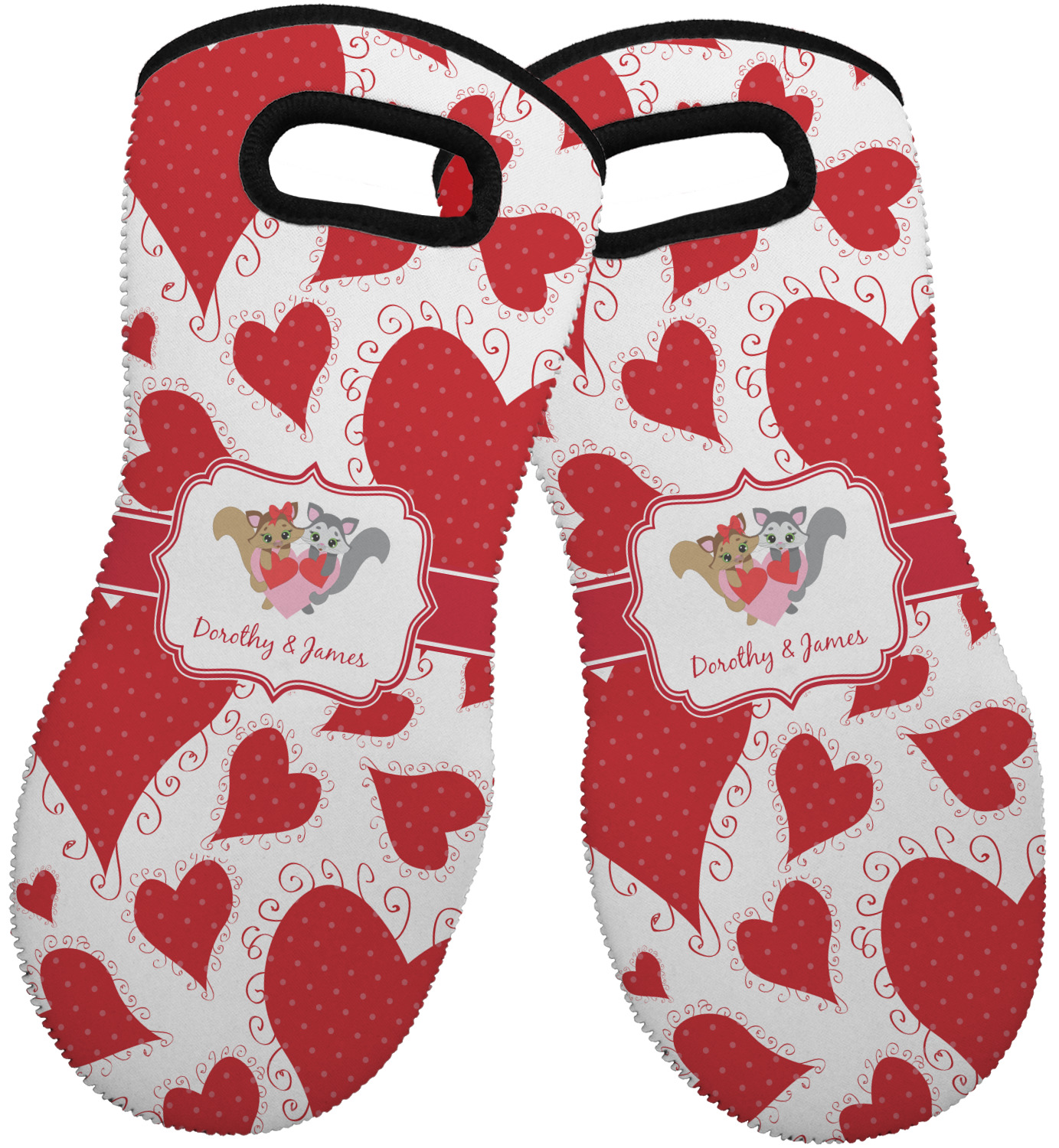These heat resistant gloves are made entirely of a durable neoprene; the front features a softer texture, while the palm's side has a textured surface, meant to handle heat up to 500 degrees Fahrenheit. Thick, heavy duty stitching connects the two sides. A small, oval cutout appears on the front, and can be used to hang and store the mitt. Your personalization appears on the front, and the upper part of the back of the mitt. The style of these oven mitts are suitable for both the right and left hand, depending on your needs. If you need one for each hand, be sure to order two!