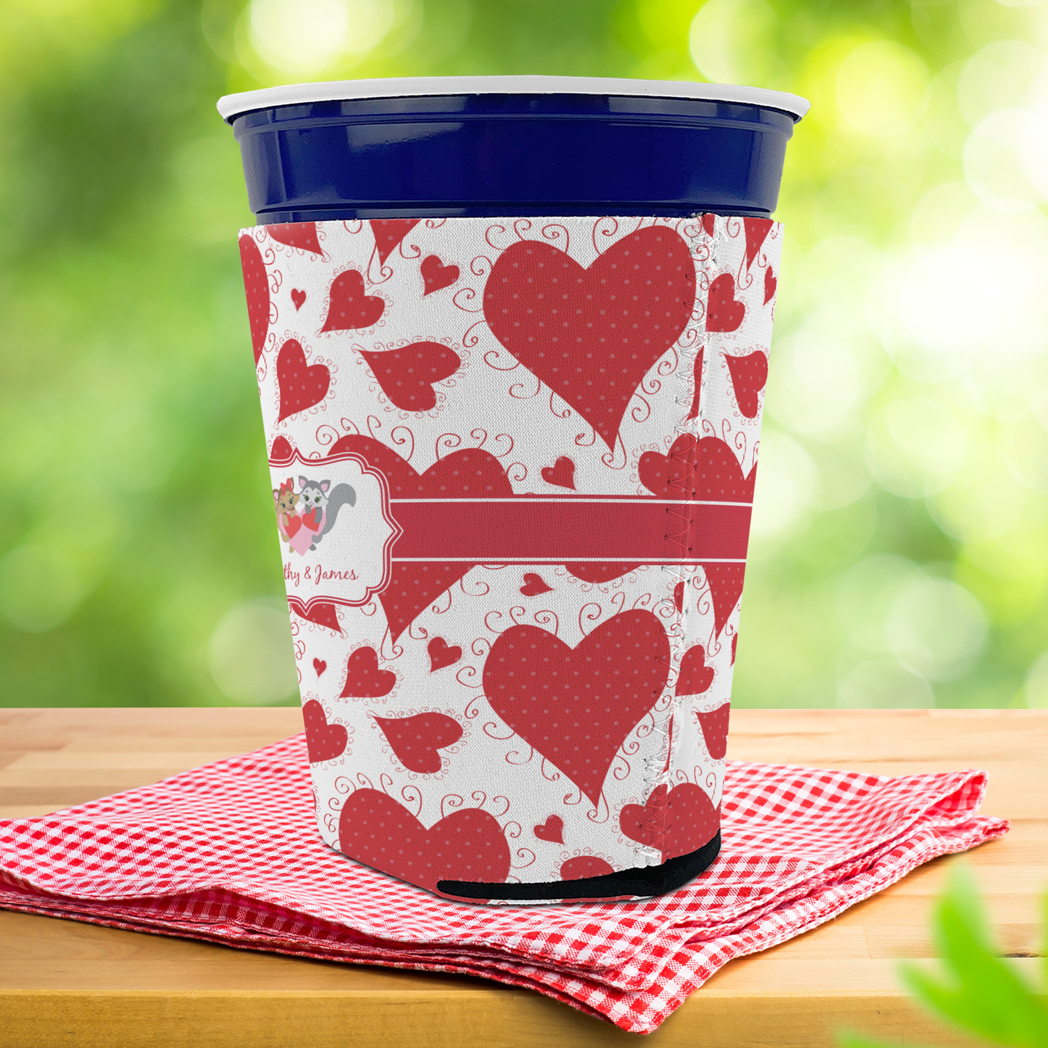 Made from neoprene with a polyester outer fabric and sewn seams, these premium quality party cup sleeves are very durable and will hold up to heavy use. They are available in 2 styles - with a bottom or just a sleeve to go around the outside of the tapered cup. The sleeve covers are about 4" tall and cover about 90% of the classic 16 oz. Solo cup.