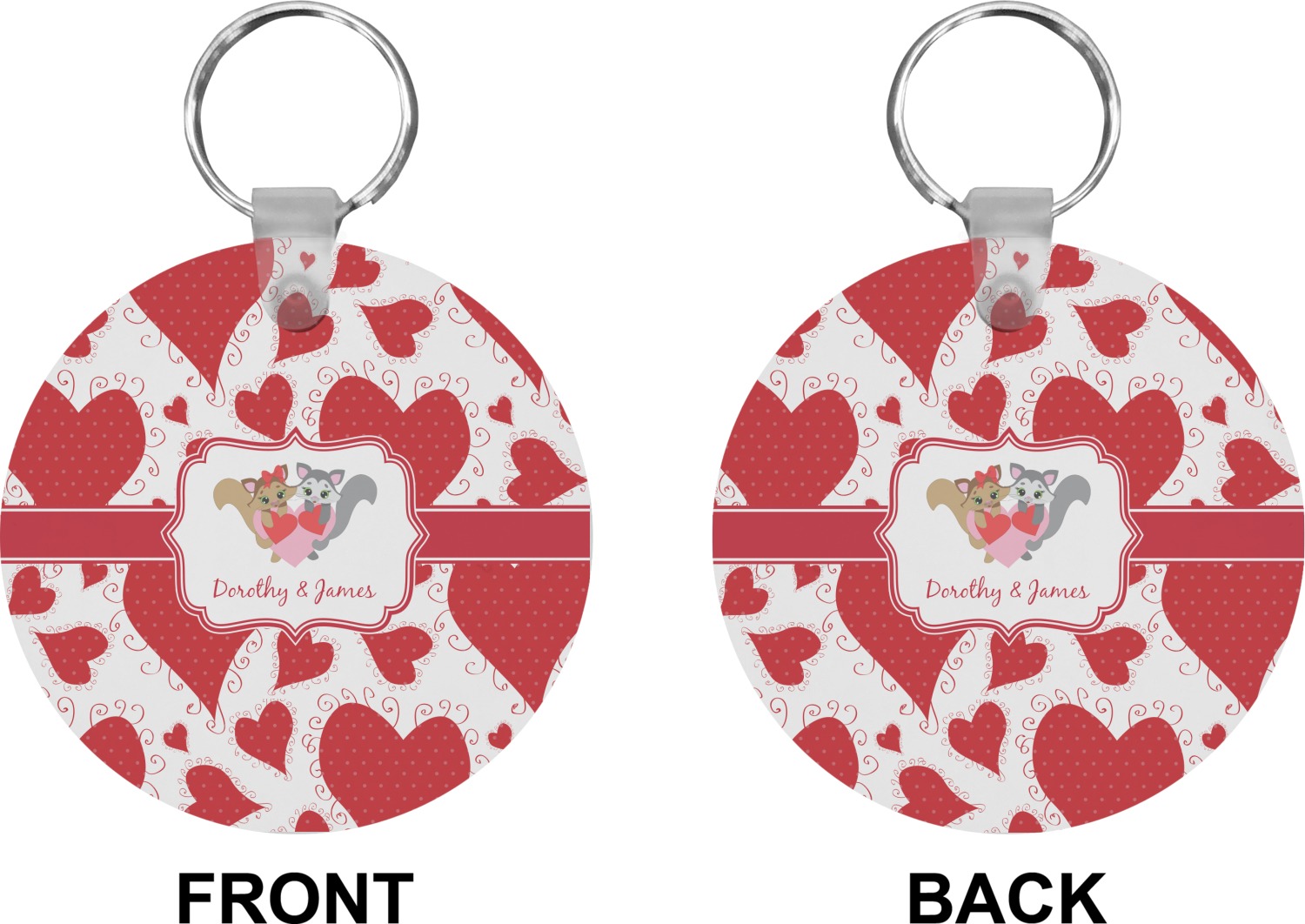 Our personalized keychains attach to the included metal, split key ring with a plastic, removable snap. Since a metal ring is included with your purchase, you have the liberty to keep your keys together on the ring, with or without your unique keychain. We offer this keychain in three different shapes: circle, heart, or diamond. We print your personalized design(s) on both sides of the key chain, and the surface has a glossy, reflective finish that only emphasizes your design. Each keychain is approximately 2.25 by 2.25 inches.