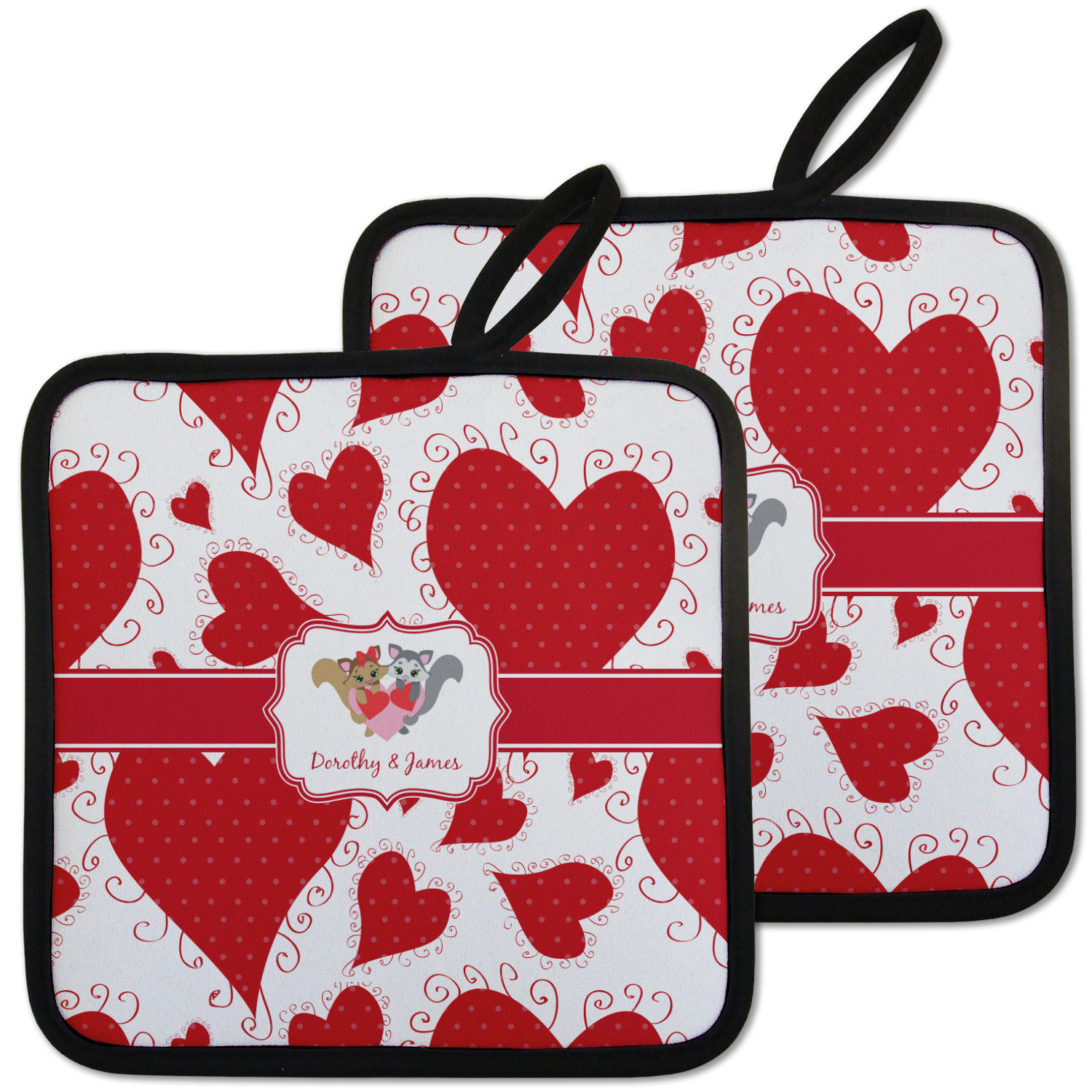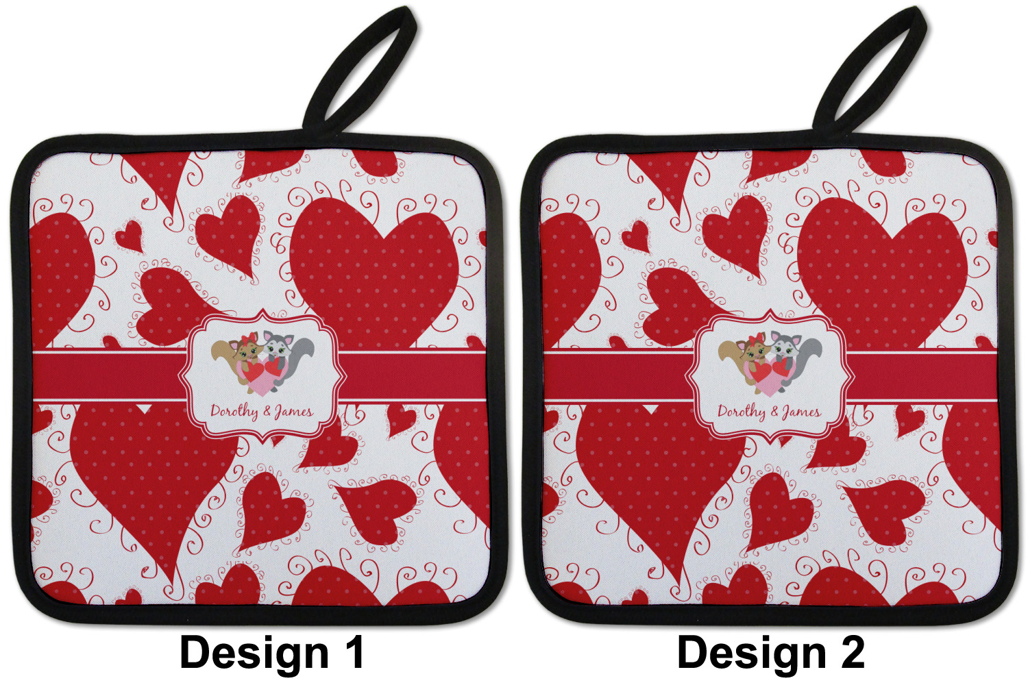 Our personalized pot holders feature a neoprene front that displays your personalization in vibrant colors. The backing of the hot pot holder is rubberized; the textured backing allows you to have a great grip when using this custom pot holder. The two materials are joined with a sleek, black trim, and the holder also includes an attached loop for hanging and storage. The pot holder is approximately 8.75 inches by 8.75 inches and 0.25 inches tall, while the fabric loop is 2.5 inches long. You can purchase a kitchen pot holder by itself or as a set of 2. We also offer a set including one pot holder and one oven mitt.