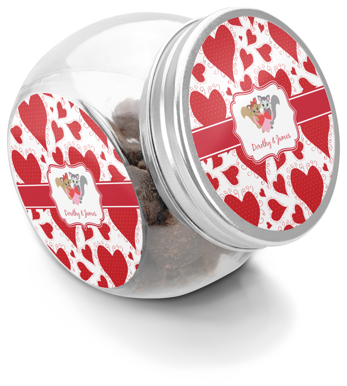 This treat jar is an excellent way to store treats for your favorite canine or feline. Moreover, their delicate, classy appearance makes them a tasteful addition to your countertop's décor. Crafted from clear glass, its unique construction and silver metal, screw-on lid allows for quick and easy access. Three, permanent, vinyl stickers are applied to both sides of the jar and lid, presenting your personalized design. The base of this glass, dog treat jar is 3.4" x 4.75", and the jar stands at 5" tall. Though on the smaller side, this jar is best suited for smaller treats or training treats.