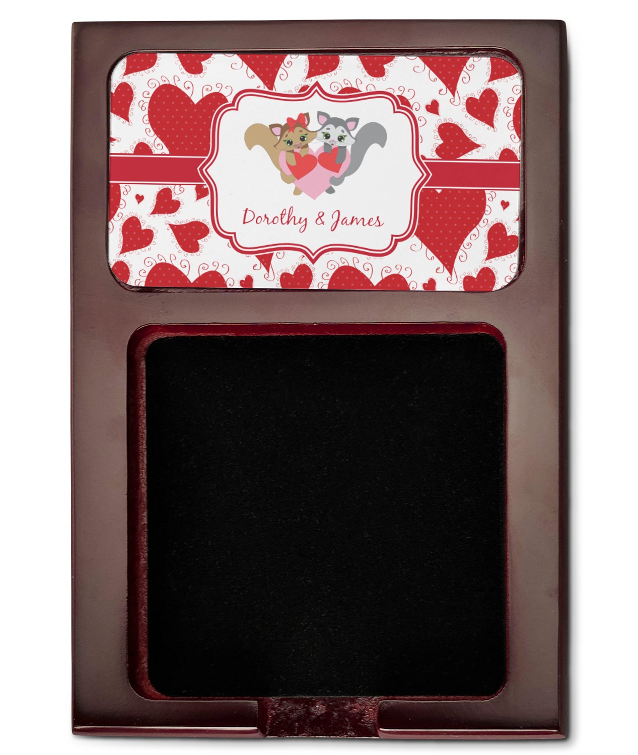 Crafted from a fine mahogany, this post it note holder is in the shade of a dark, cherry color. The dispenser itself is about 4.25 by 6.25 by 0.75 inches. You can place your 3 by 3 inch sticky notes in the indentation below the nameplate. We print your customization onto the nameplate that rests above the velvety indentation.