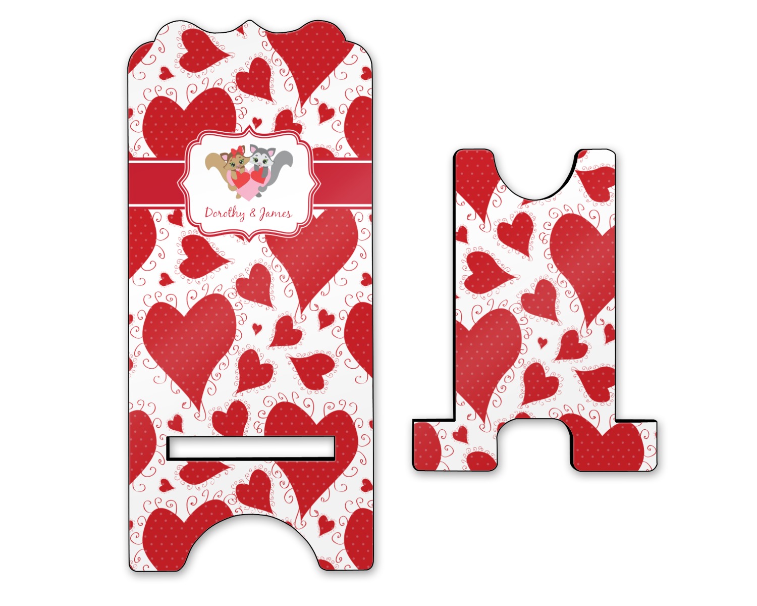 To meet your needs, we offer four variations of this IPhone stand. The backboard of the first version is shaped as a plain, yet sleek rectangle, and is available in two sizes. Our smaller size is approximately 4 by 3.25 by 7 inches, while the larger model is 4 by 3.77 by 8.5 inches. Alongside this model, we also provide you with a more decorative option. The upper part of our second version features a curved edge, for a classy, suave appearance. This phone holder is also sold in two sizes: a smaller version, which is 4 by 3.25 by 7 inches, and our larger model, which is 4 by 3.77 by 8.5 inches. Both models will support large phones, but the larger model is better if you wish to proudly display your personalized design.