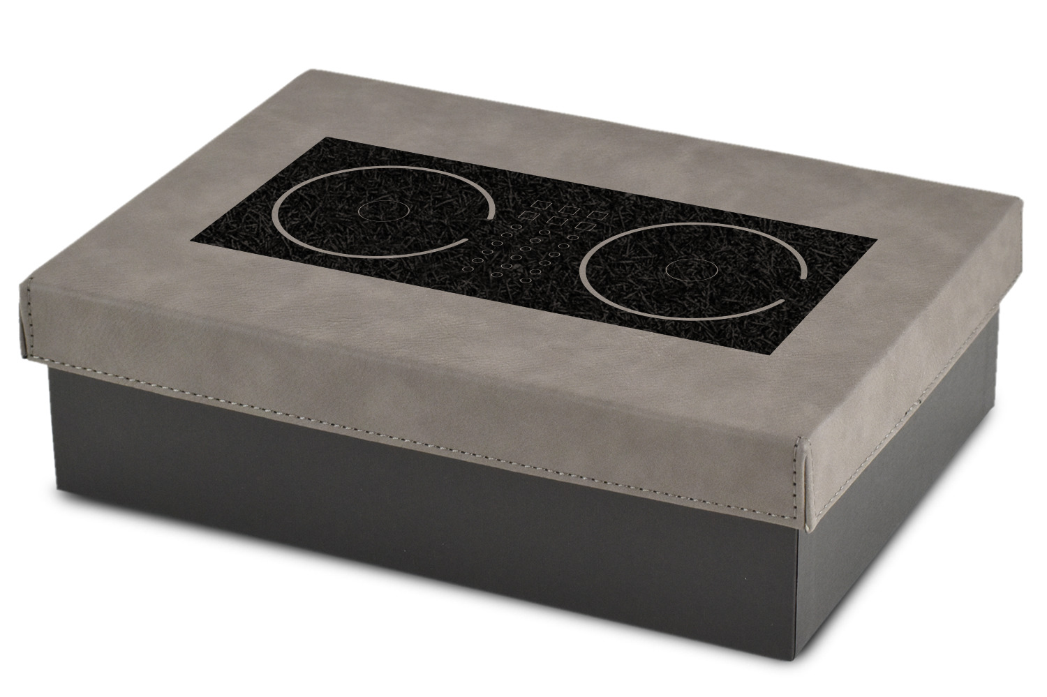 These gift boxes are available in 3 different sizes to accommodate various sized gifts. Available in gray as a neutral color for any occasion as well as to showcase your design boldly. Engraved with a laser this high quality paper board and faux leather gift box is unique and makes any gift stand out.