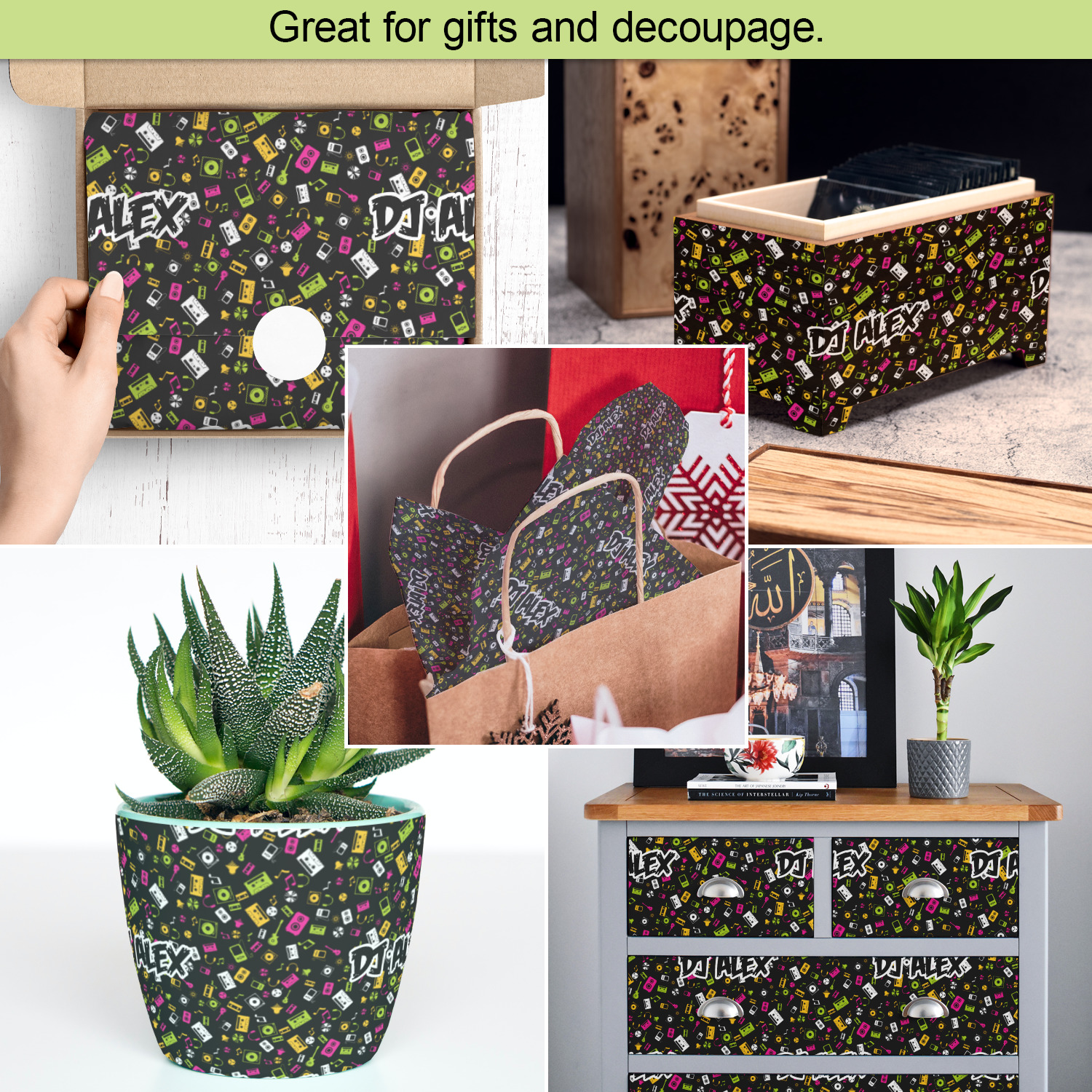 With our tissue paper sheets, you can now print whatever you want to decoupage. You don't have to figure out how to get text on top of purchased papers. You can design it all into a sheet(s) and decorate items exactly the way you want to.