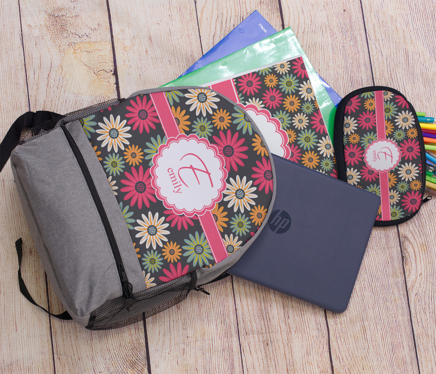 The flowers in this design are are a vibrant mix of fall colors, all on a deep gray background. The design has a classic ribbon in hot pink, the perfect place to add a name for that personal touch to pull the entire design together.