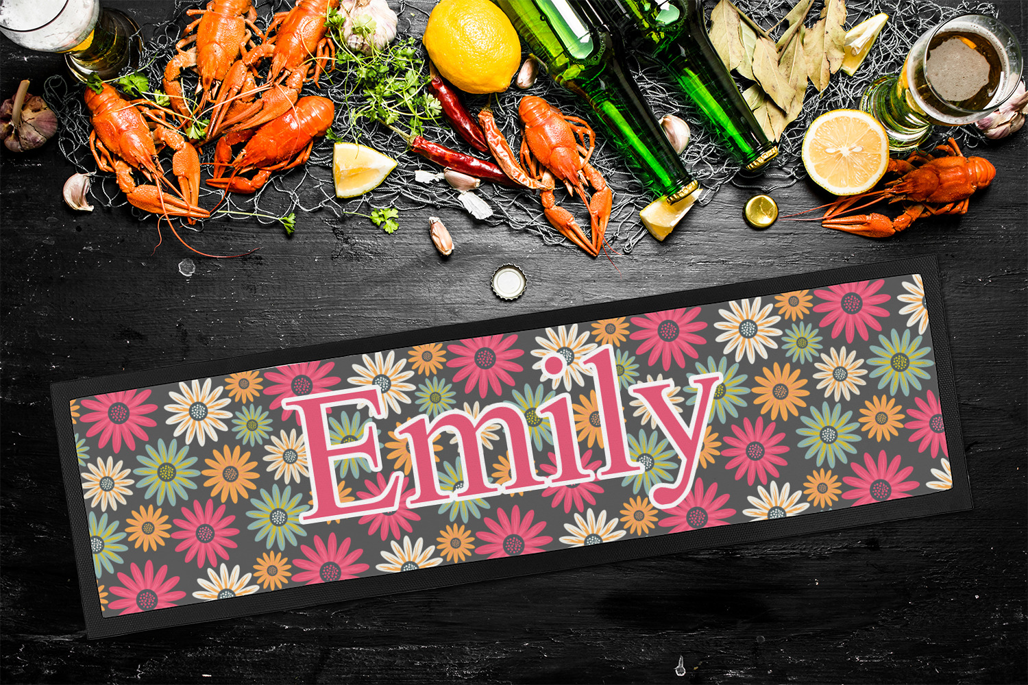 The flowers in this design are are a vibrant mix of fall colors, all on a deep gray background. The design has a classic ribbon in hot pink, the perfect place to add a name for that personal touch to pull the entire design together.