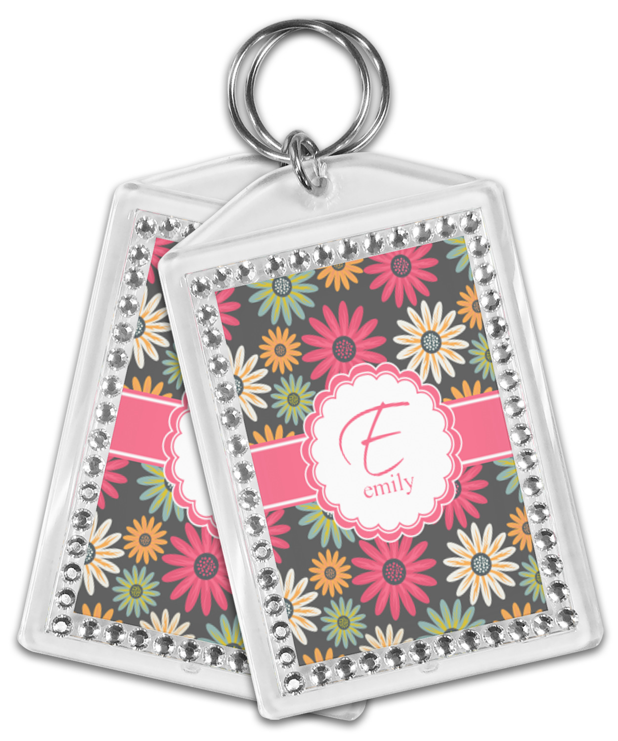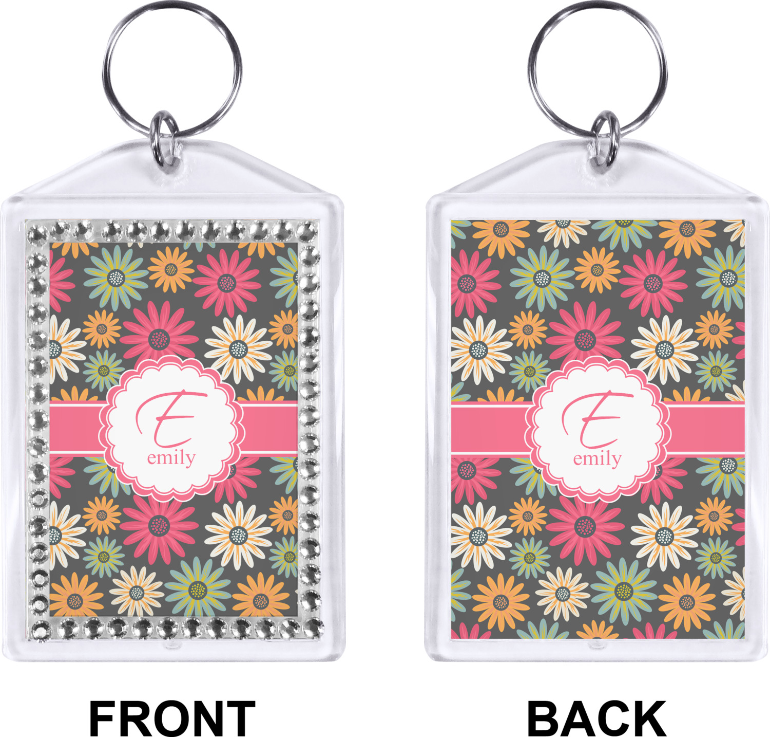 Our personalized keychains have a bold, rectangular shape, outlined by a series of shimmering rhinestones. A metal, split keyring is included with your purchase, and an additional metal hoop allows for attachment of the keychain to the split ring. This unique keychain measures at about 3.75 by 2.5 inches. We print your customized design(s) across both the back and front of this keychain.