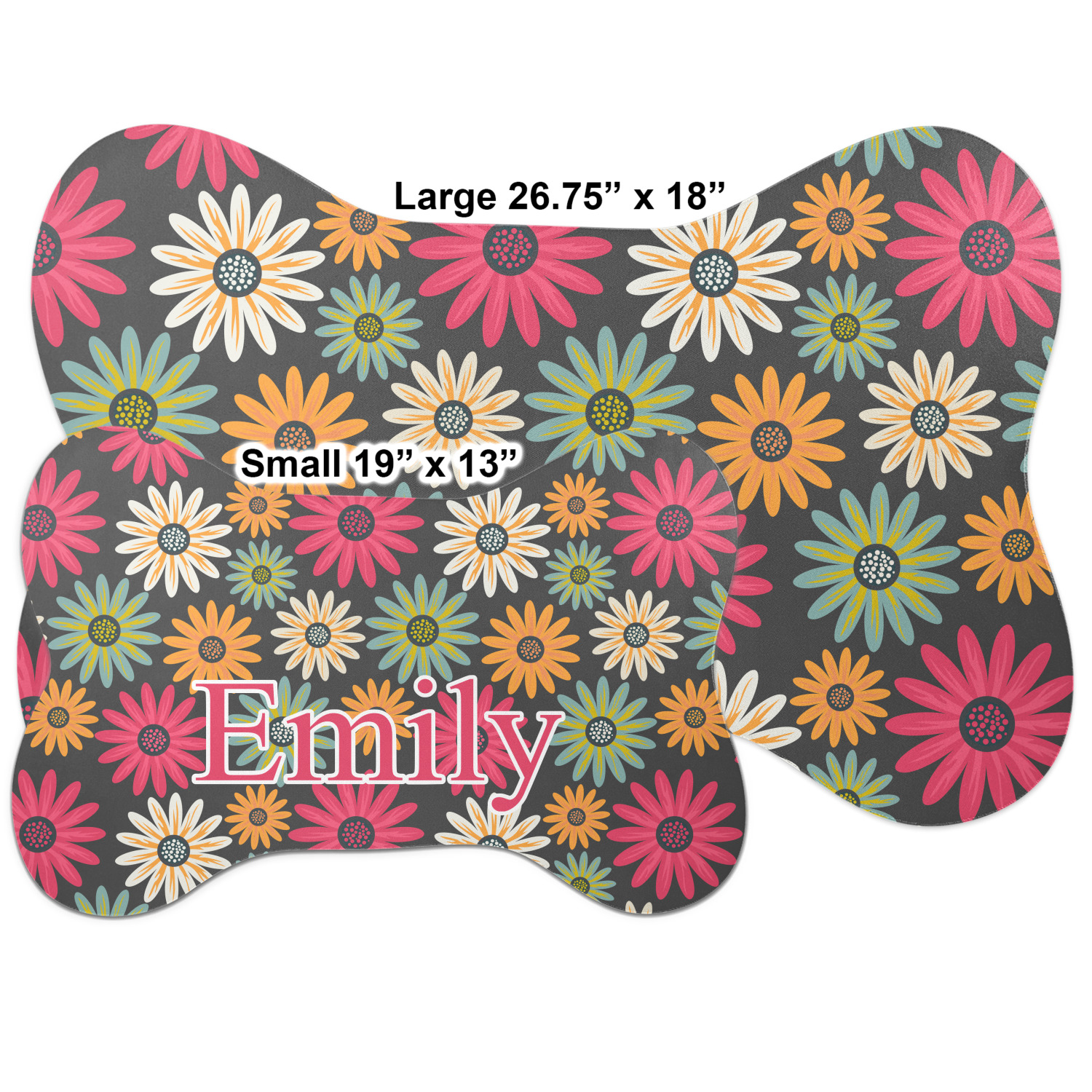The top of this mat displays your custom design, as it is printed on polyester. To prevent slippage, the underside of the mat is made of rubber. We offer a small dog food mat, suitable for smaller dogs and a large dog food mat for bigger breeds. The small dog food mat is approximately 19 by 13 inches, while the large dog feeding mat measures at approximately 26.75 by 18 inches. Both personalized mats are ideally sized to fit two dog bowls.
