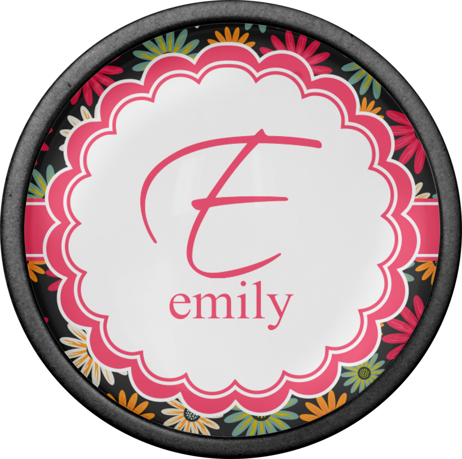 The flowers in this design are are a vibrant mix of fall colors, all on a deep gray background. The design has a classic ribbon in hot pink, the perfect place to add a name for that personal touch to pull the entire design together.