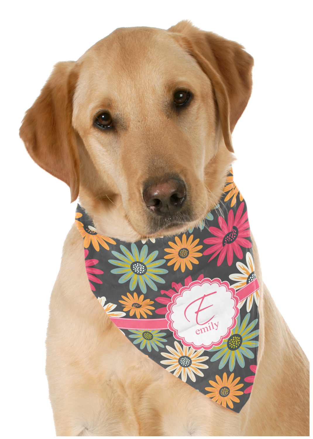 This beautiful pet bandana really is the perfect accessory. It is made from a silky feeling polyester and measures at approximately 23" x 23". Your personalization will be printed on a diagonal, so that you are able to read the personalization when folded into a triangle. This bandana fits best on large dogs, but can be folded smaller if there is no personalized text to fit smaller pets.
