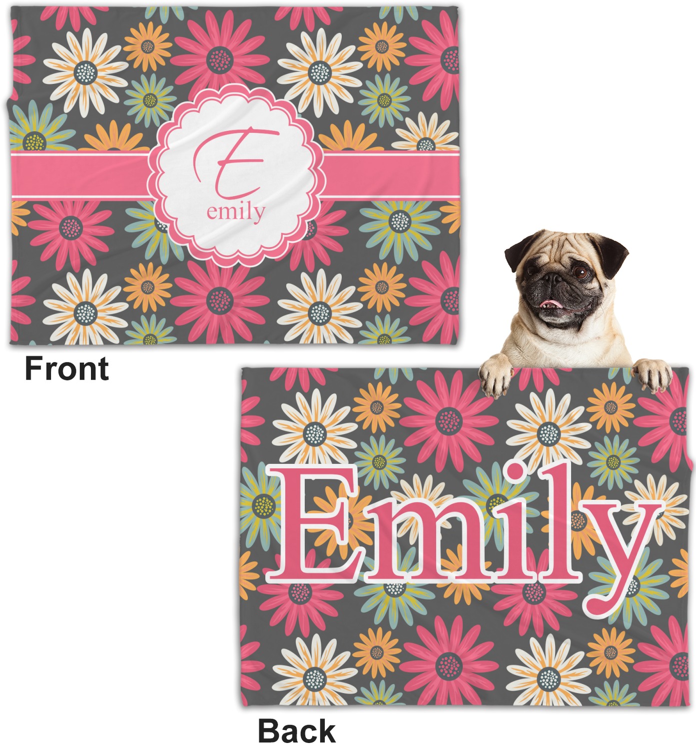 These dog blankets are crafted from a gentle, soft-to-the-touch, minky material. We print your customizations, either matching or differing, on both the top and underside of the blanket. These personalized dog blankets are available in two sizes: regular and large. Our regular size, at 40" x 30", accommodates small and some medium size dogs. At 60" x 50", our large dog blanket is a better fit for bigger breeds. Though specialized for dogs, these blankets still make a thoughtful gift for your favorite feline, or any other pet in mind!