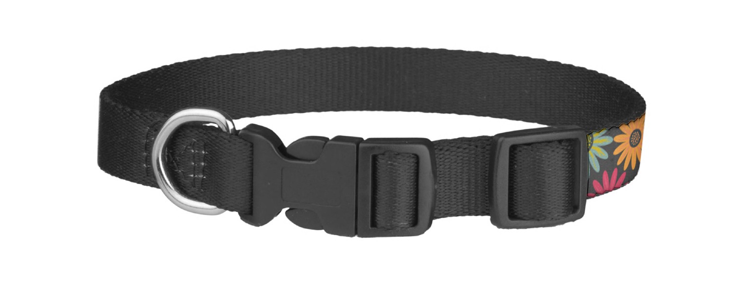 This sturdy collar, made from a durable nylon weave, will outlive your dog's episodes of excited tugging and pulling. Courtesy of its thick plastic buckle and adjuster, this collar is adjustable and accommodating of any dog. Structurally, the collar is a single piece of nylon weave that is sewn together, and features a solid metal loop where you can attach a leash or dog tag. We print and display your dog's name and pattern across the middle of the personalized dog collar.