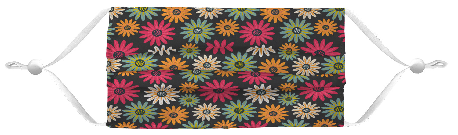 These fun face masks are 7" wide and 3.5" high. They feature pleats, adjustable ear loops, and are made with two layers of fabric. The top layer where your design is printed is a breathable polyester sheeting, while the inside layer is a soft microfiber polyester