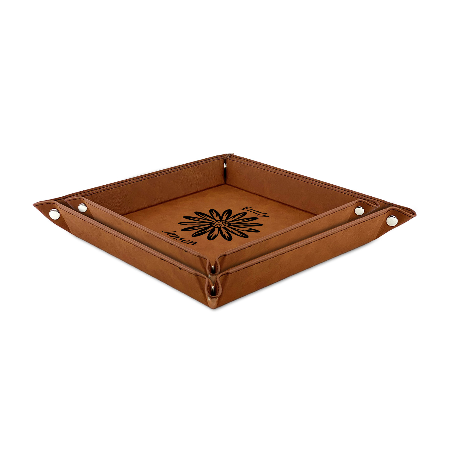 The leatherette wraps the hard board base and sides with flexible hinges to fold the sides up. The corners are secured using silver snaps. The 6in x 6 in tray measures approximately 9.5in x 9.5in when laid flat. The 9in x 9in tray measures approximately 13in x 13in when laid flat.