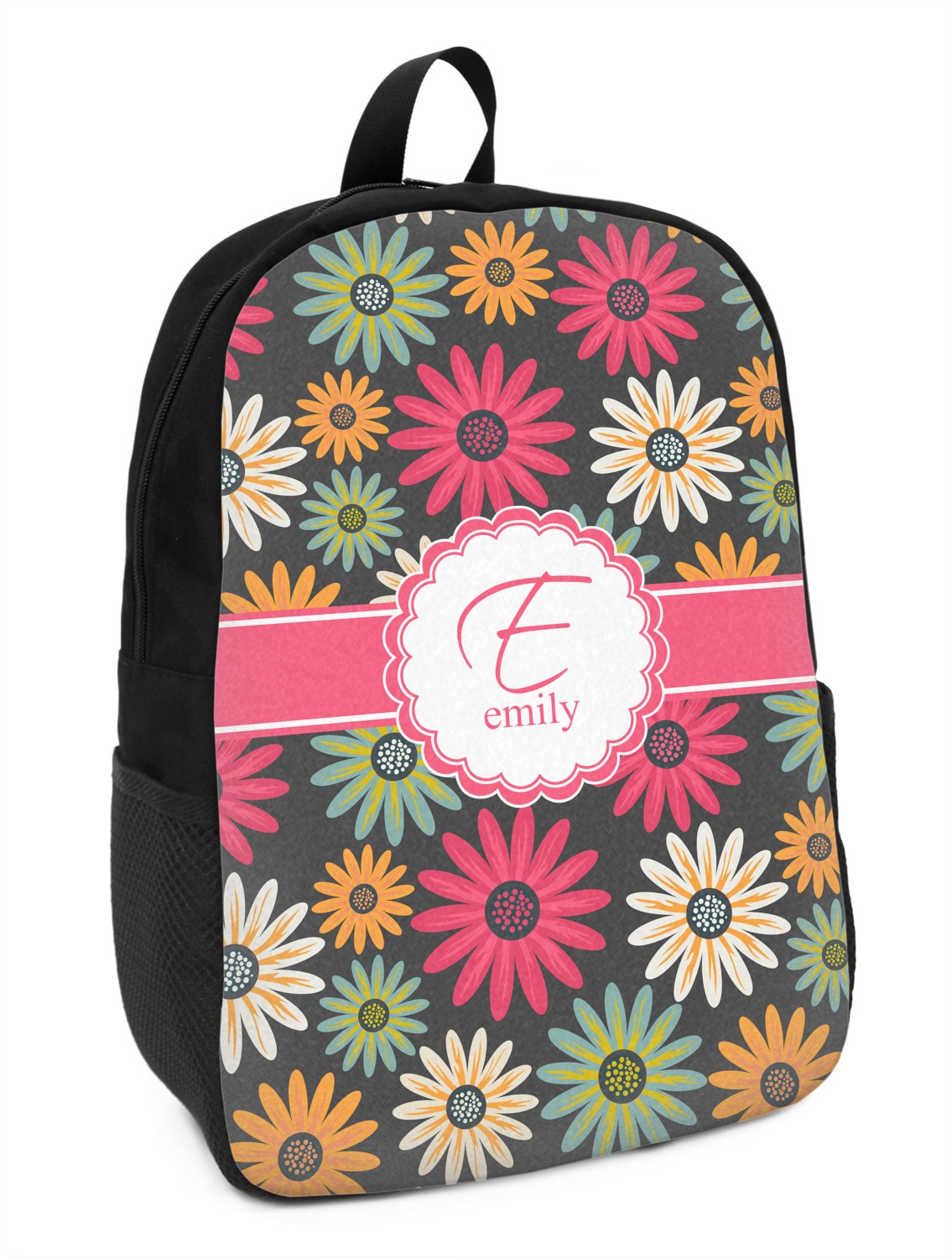 These small backpacks are made of a durable black canvas material with your personalization right on the front. The two shoulder straps are padded and easily adjustable. The bag itself measures at about 11" W x 15" H x 5" D. It's the perfect size for elementary aged kids or adults who want a smaller backpack. On the top of the bag you will find a handle to hang or carry your backpack by as well as a large zipper closure to keep all of your belongings safe inside. On each side of your backpack is a mesh pocket for a small item or water bottle. Inside your backpack you will find a spacious area with a small zipper pocket and a padded laptop slot that will fit up to a 13" laptop (13" being very snug). This is the perfect bag for any student that needs a couple books and their laptop with them at all times. It also works great as a carry on for traveling!