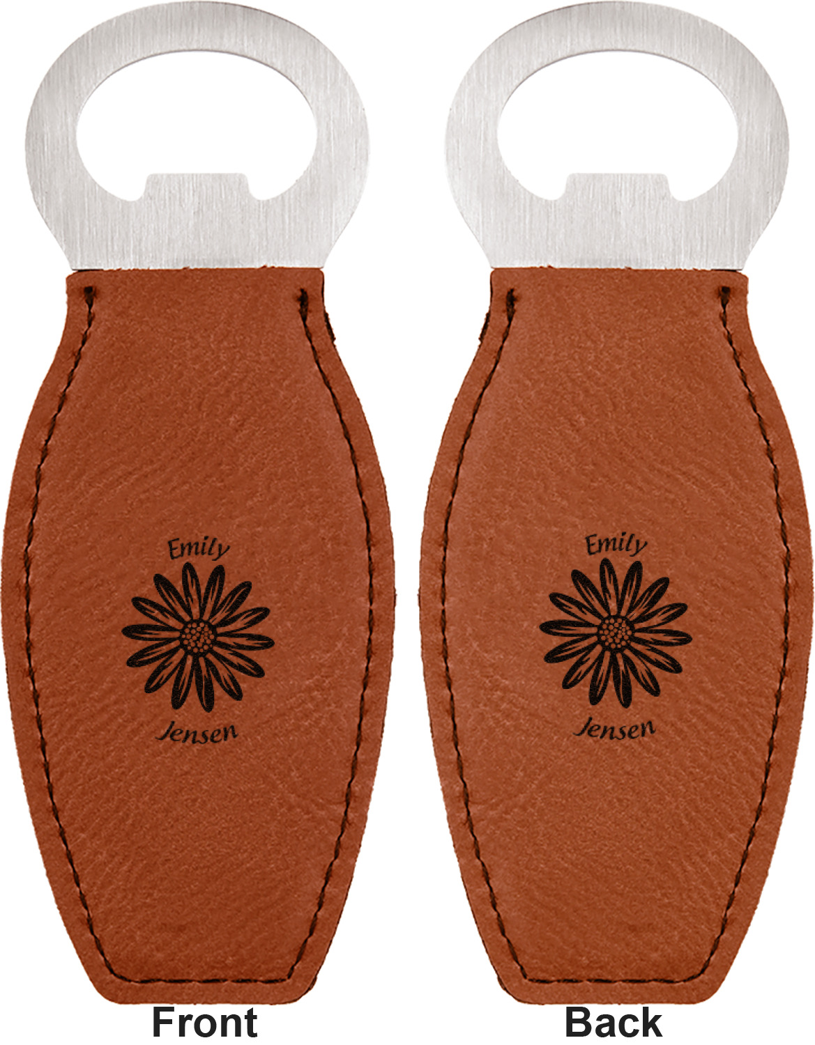 Built from stainless steel, these custom bottle openers are wrapped in a cognac-colored leatherette. Sharp, black stitching lines the edges for extra durability and a finished touch. Your personalization is laser-engraved onto the surface of this leatherette, leaving behind a crisp, black coloration. At 4.6 by 1.8 inches, this beer bottle opener gives you much of leverage when trying to open a stubborn bottle. On the opposite end of the opener, you'll find a magnet that you can use to display your new, unique bottle opener!
