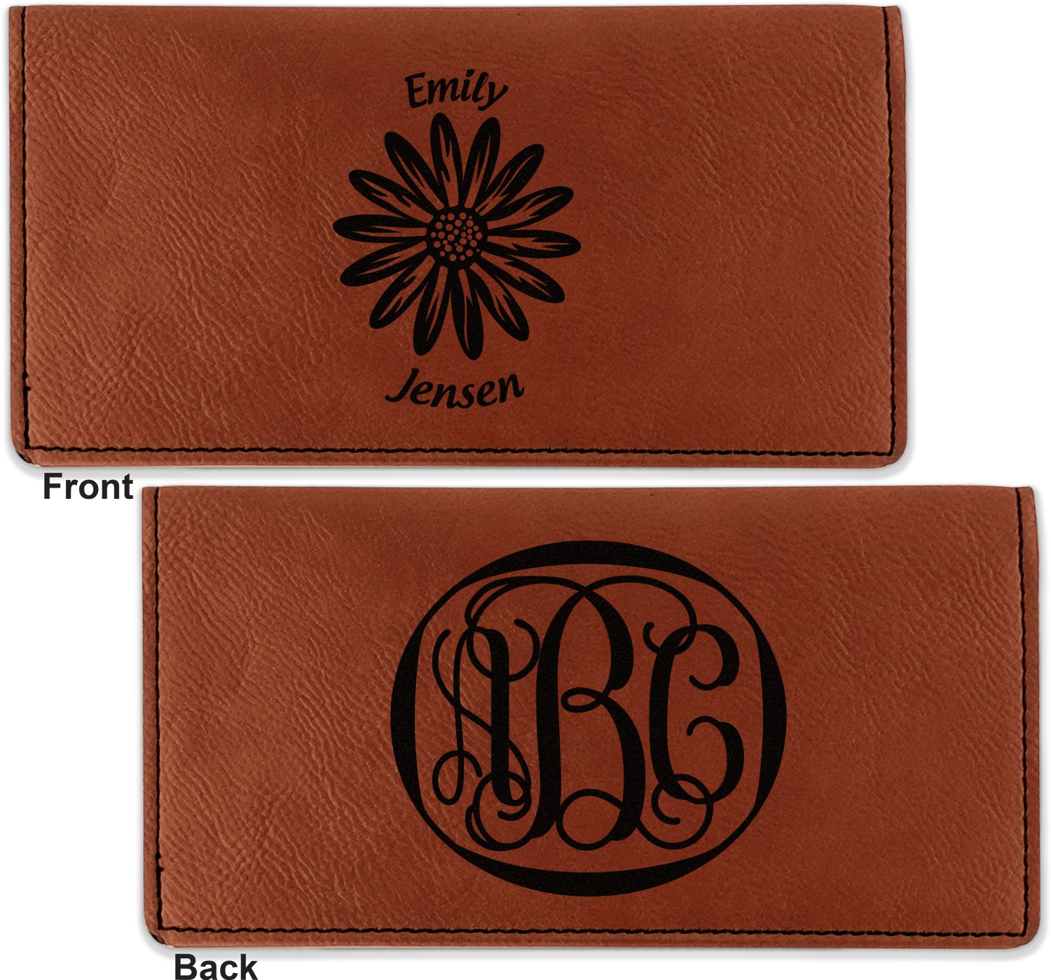 Go into our design center to start personalizing. Your checkbook cover will be laser engraved, making the graphic or text a black color. Choose a fun saying, monogram, or font to go on your checkbook cover. You have the opportunity to do it double or single sided.