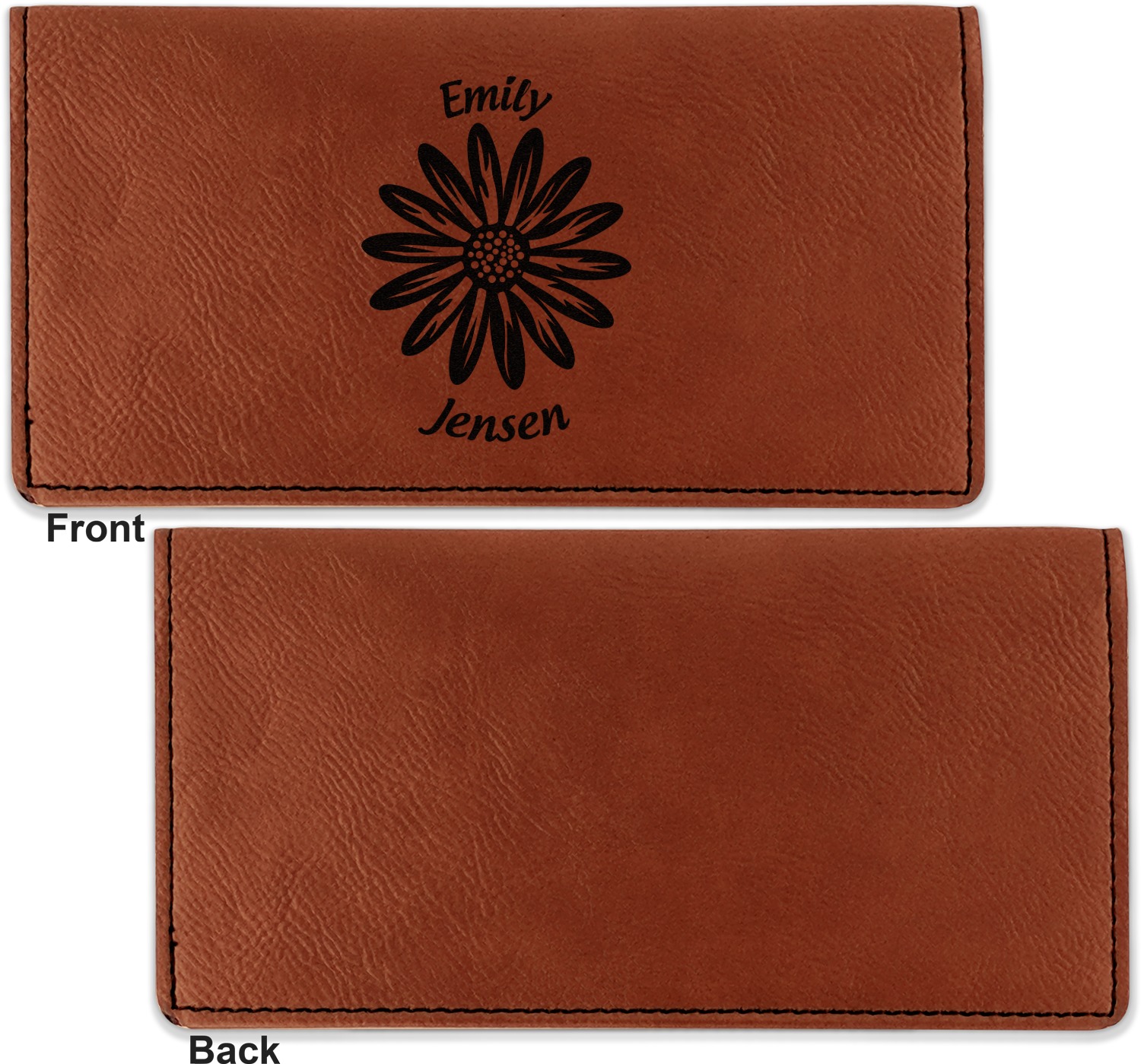 Go into our design center to start personalizing. Your checkbook cover will be laser engraved, making the graphic or text a black color. Choose a fun saying, monogram, or font to go on your checkbook cover. You have the opportunity to do it double or single sided.