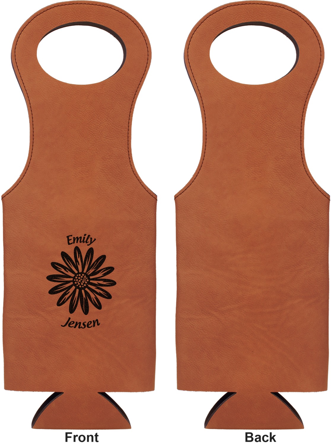 This wine carrier is made from a stunning leatherette, in a cognac-brown color. Strong, black stitching lines the sides of your wine bottle bag and provides extra durability. The interior is lined with a padded, black material to allow for a snug fit once your bottle is placed inside. At the top of this wine gift bag, you'll find two oval shaped handles that elegantly complements the rest of the bag's style. We provide you with the option of laser-engraving the front, or the front and back of your new personalized wine bag!