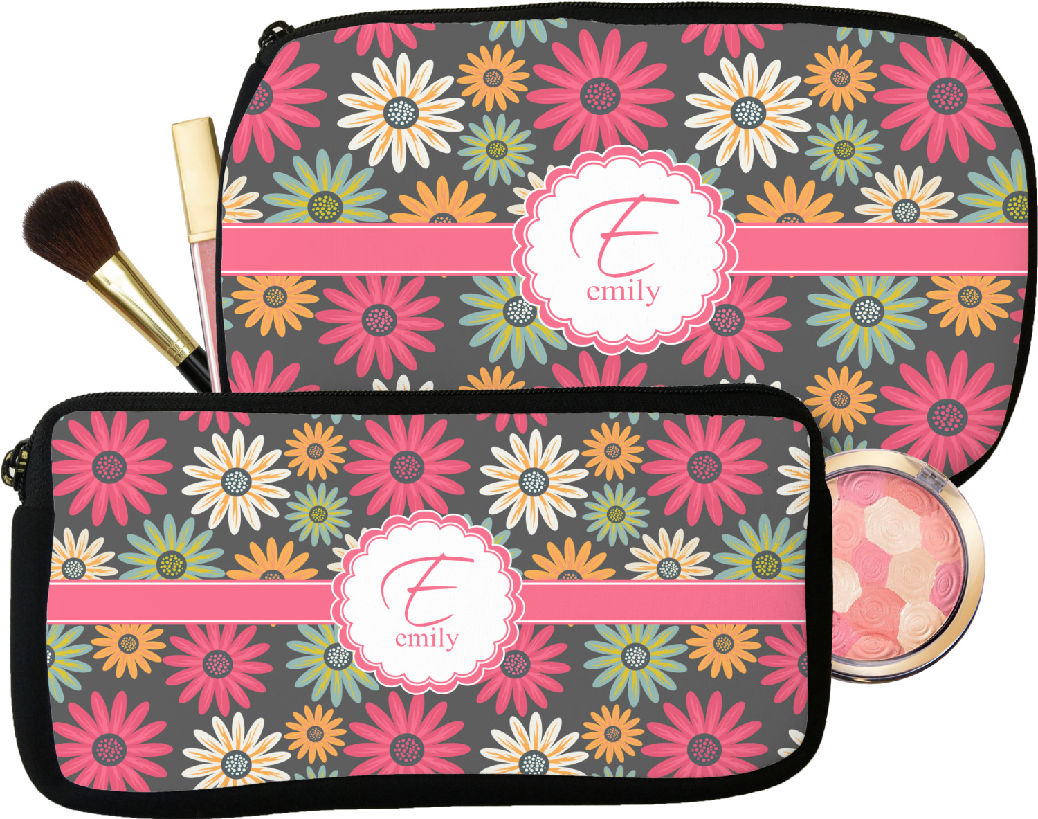 Our personalized makeup bags are available in many different designs, patterns and colors - so you are sure to find one that will love. They are made of neoprene (same material as wet-suits) and thus are water resistant, so spillages in your makeup bag will not end up all over you purse. They are customized on one side and are black on the other side and the zipper is black as well.